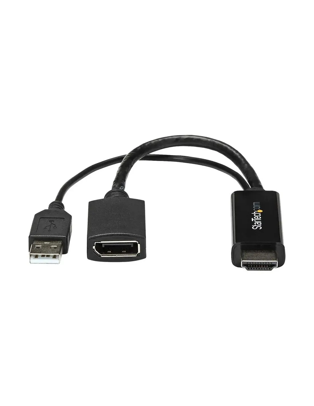 Características del Startech Conversor HDMI a DisplayPort 4K Alimentado por USBEl adaptador activo Startech HDMI a DisplayPort es la solución ideal para conectar dispositivos con salida HDMI a monitores o pantallas con entrada DisplayPort. Diseñado para ofrecer compatibilidad avanzada y calidad de imagen en 4K, este conversor es perfecto para entornos profesionales, configuraciones multimedia o puestos de trabajo que requieren fiabilidad y rendimiento.Conversión activa con soporte 4KGracias a su tecnología de conversión activa, este adaptador permite transformar señales HDMI en DisplayPort sin pérdida de calidad. Es capaz de ofrecer resoluciones de hasta 3840 x 2160 a 30 Hz, garantizando una experiencia visual nítida y estable.Resolución máxima: 3840 x 2160 (4K)Frecuencia de actualización: 30 HzAdaptador activo para mayor compatibilidadAlimentación USB para mayor estabilidadEl dispositivo incorpora alimentación mediante USB, lo que asegura un funcionamiento estable incluso en configuraciones exigentes. Incluye un cable alargador USB de 1 metro para facilitar su instalación en diferentes entornos.Alimentación mediante USB tipo ACable alargador USB incluido (1 metro)Mayor estabilidad en la señal de vídeoCompatibilidad de audio envolventeAdemás de la señal de vídeo, este adaptador permite transmitir audio envolvente 7.1, ofreciendo una experiencia multimedia completa tanto en entornos profesionales como domésticos.Soporte de audio 7.1 canalesTransmisión simultánea de audio y vídeoIdeal para contenido multimedia y presentacionesDiseño compacto y conectividad versátilCon un diseño compacto y ligero, este adaptador resulta fácil de integrar en cualquier configuración. Su longitud de 25.5 cm permite una conexión cómoda sin generar tensión en los puertos.Conector HDMI macho (entrada)Conector DisplayPort hembra (salida)Longitud del cable: 25.5 cmPeso: 37 gCumplimiento de estándares y compatibilidadEl adaptador cumple con normativas clave como FCC, RoHS y HDCP 2.2, garantizando seguridad, sostenibilidad y compatibilidad con contenido protegido. Además, está diseñado para integrarse con modelos específicos de Startech.Cumplimiento: FCC, RoHS, HDCP 2.2Compatible con P/N: SV211HDUC, SV221HUC4KColor: NegroOtras especificacionesAnchura: 2.3 cmAltura: 1.3 cmDimensiones del embalaje: 22.1 x 18.5 x 3.3 cmPeso del embalaje: 137 gInterfaz soportada: DisplayPort / HDMI