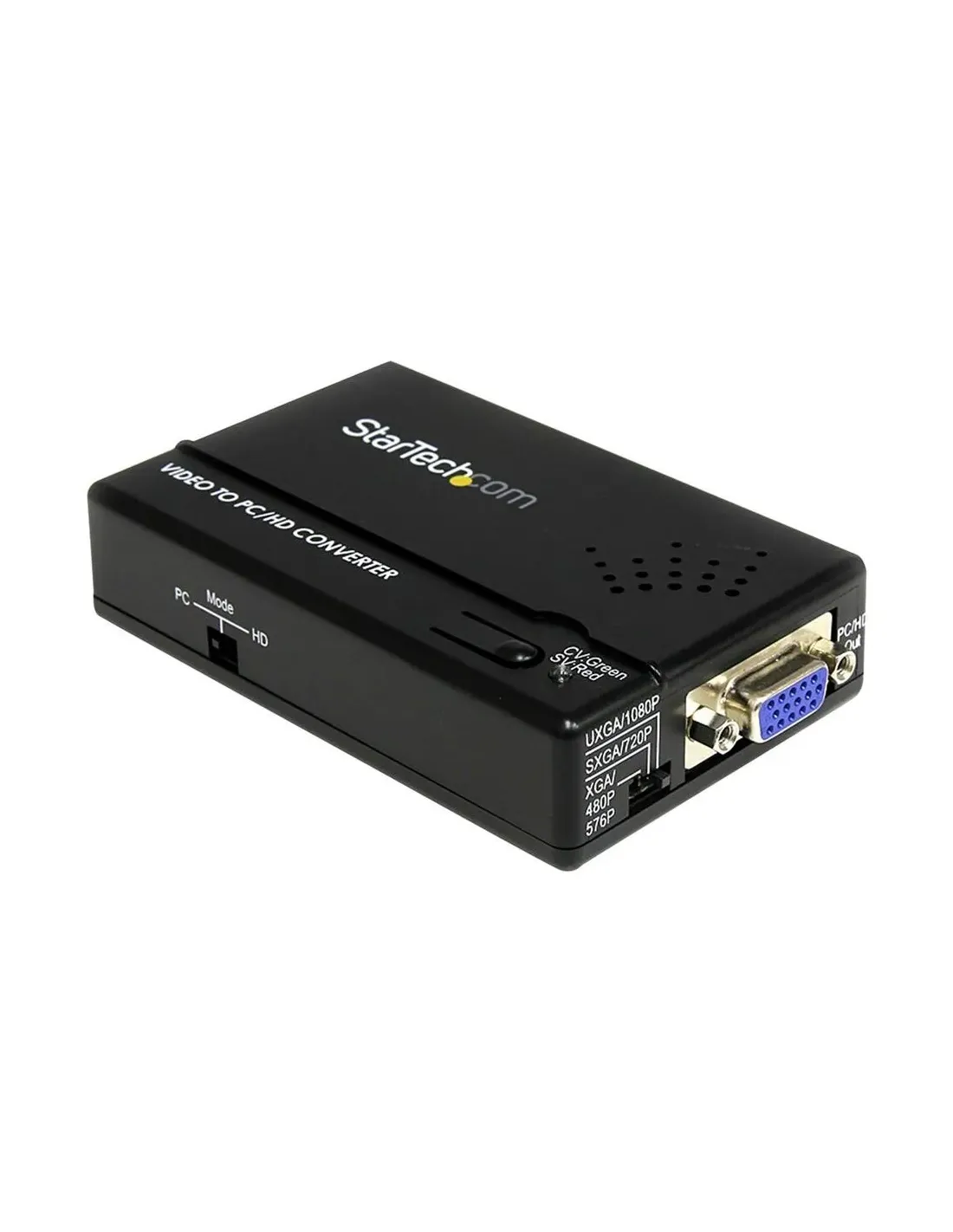 Características del StarTech.com Adaptador Conversor Escalador de S-Video a VGAEl adaptador conversor escalador StarTech.com es una solución práctica para convertir señales de vídeo analógico como S-Video o vídeo compuesto a salida VGA, permitiendo conectar dispositivos antiguos a monitores o pantallas modernas. Diseñado para ofrecer compatibilidad y facilidad de uso, es ideal para entornos profesionales, educativos o domésticos donde se necesite reutilizar equipos legacy.Conversión de señal versátilEste conversor permite transformar diferentes formatos de entrada analógica en una salida VGA, facilitando la integración de dispositivos como reproductores DVD, videocámaras o consolas clásicas en monitores actuales. Su compatibilidad con sistemas NTSC y PAL garantiza un uso global sin complicaciones.Entrada S-Video (mini-DIN de 4 patillas)Entrada de vídeo compuesto (RCA)Salida VGA (HD-15)Resolución escalada hasta Full HDEl dispositivo incorpora función de escalado que permite adaptar la señal de entrada a resoluciones superiores, ofreciendo una visualización más clara en pantallas modernas. Soporta resoluciones de hasta 1920x1080 (1080p), asegurando una experiencia visual mejorada.Soporte XGA: 1024x768Soporte SXGA: 1280x1024Soporte UXGA: 1600x1200Soporte HDTV: 1920x1080 (1080p)Instalación sencilla Plug and PlayGracias a su compatibilidad Plug and Play, este conversor no requiere instalación de software adicional, permitiendo una puesta en marcha rápida y sencilla. Solo tienes que conectar los dispositivos y comenzar a utilizarlo.Funcionamiento sin driversConfiguración rápidaUso inmediatoDiseño compacto y ligeroSu formato compacto y peso reducido lo convierten en una opción fácil de transportar e integrar en cualquier instalación. Su acabado en color negro ofrece un aspecto discreto y profesional.Dimensiones: 6.4 x 11.2 x 2.6 cmPeso: 90 gColor: negroConectividad adicional y accesorios incluidosIncluye un adaptador para salida de vídeo por componentes, ampliando sus posibilidades de conexión y compatibilidad con diferentes dispositivos.Salida de vídeo por componentes (RCA x3 con adaptador)Cable adaptador incluido (91.44 cm)Conexiones versátiles para distintos entornosOtras especificacionesTemperatura de funcionamiento: 0 °C a 40 °CHumedad de funcionamiento: 0 - 60%