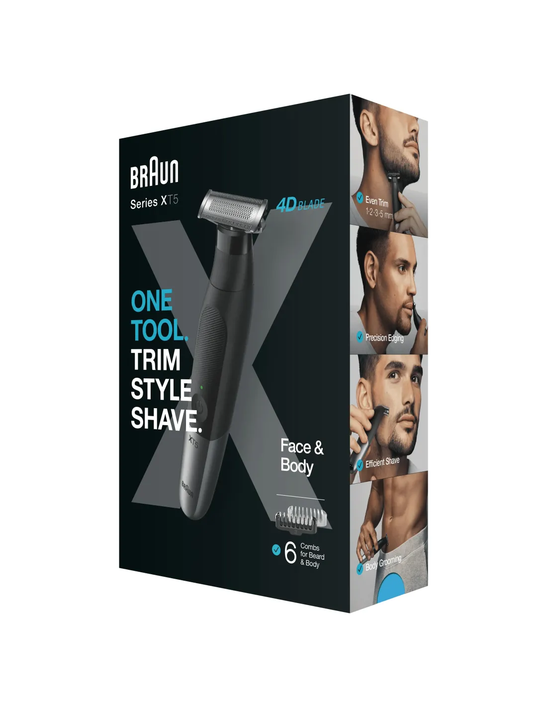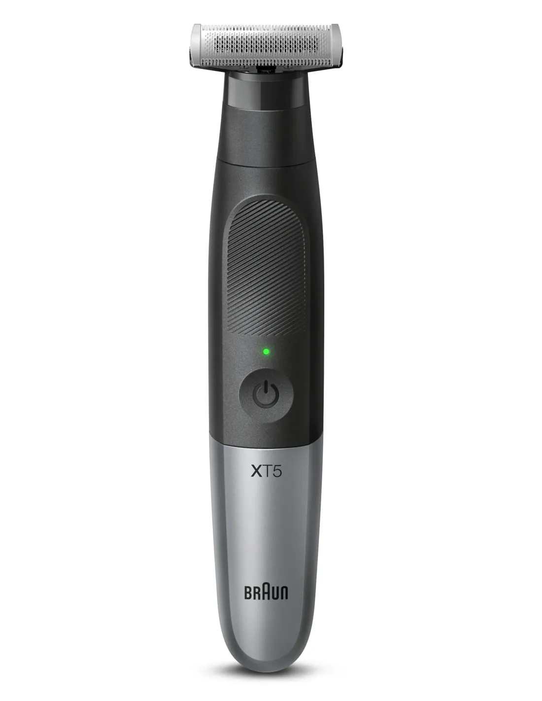 La Braun Series XT5 es una recortadora de barba, una depiladora corporal y una maquinilla eléctrica para hombre, todo en una sola herramienta. Su lámina 4D ofrece un afeitado fácil, rápido y agradable,suave para la piel.Esta recortadora y afeitadora 100% resistente al agua se puede usar en mojado o en seco, y su lámina metálica está fabricada para durar hasta 6 meses. El esbelto diseño del mango de Series X haceque sea muy fácil de manejar, independientemente del tipo de afeitado que estés realizando..La caja incluye: 1 afeitadora eléctrica, 4 peines faciales (1 mm, 2 mm, 3 mm, 5 mm), 2 peines corporales (0 mm SkinGuard, 3 mm),1 funda para viaje, 1 enchufe inteligente.Características:Recorta, perfila y afeita con una herramienta: recortadora de barba, afeitadora para cuerpo y maquinilla eléctrica para hombre. Para la cara (peines de 1, 2, 3, 5 mm) y el cuerpo (peines suaves y de 3mm).Rápida y eficiente: la lámina 4D ahora tiene una zona de corte 2 veces más ancha y realiza 450 movimientos por segundo para un afeitado rápido. La lámina de acero inoxidable se mantiene afiladahasta 6 meses.Fácil y cómoda: consigue fácilmente resultados increíbles y líneas precisas, incluso en las zonas complicadas, con el cabezal flexible oscilante y los peines bidireccionales que recortan en cualquierdirección.Suave con la piel: el peine protector de la piel SkinGuard y el diseño de lámina enjaulada protegen la piel de la lámina, incluso en áreas sensibles.Diseñada para durar: 100 % resistente al agua con mango antideslizante de goma y 45 minutos de autonomía inalámbrica. Incluye bolsa con cierre de cordón para almacenamiento en el baño.EspecificacionesDesempeñoSistema de afeitado: Máquina de afeitar de láminasRecortadora: SiApto para pieles sensibles: SiAcciones de corte por minuto: 450Tipo de control: BotonesMojado y seco: SiNúmero de máquina de afeitar cabezas / cuchillas: 1DiseñoColor del producto: Negro, MetálicoLavable: SiA prueba de agua: SiIndicadores LED: PoderControl de energíaFuente de energía: Corriente alternaRecargable: SiTipo de batería: Batería integradaContenido del embalajeCargador: SiFunda: SiTapa protectora: SiPeines accesorios: Barba, CuerpoNúmero de peines-guía: 6EmpaquetadoTipo de embalaje: CajaCantidad: 1Detalles técnicosEstuche de viaje: Si