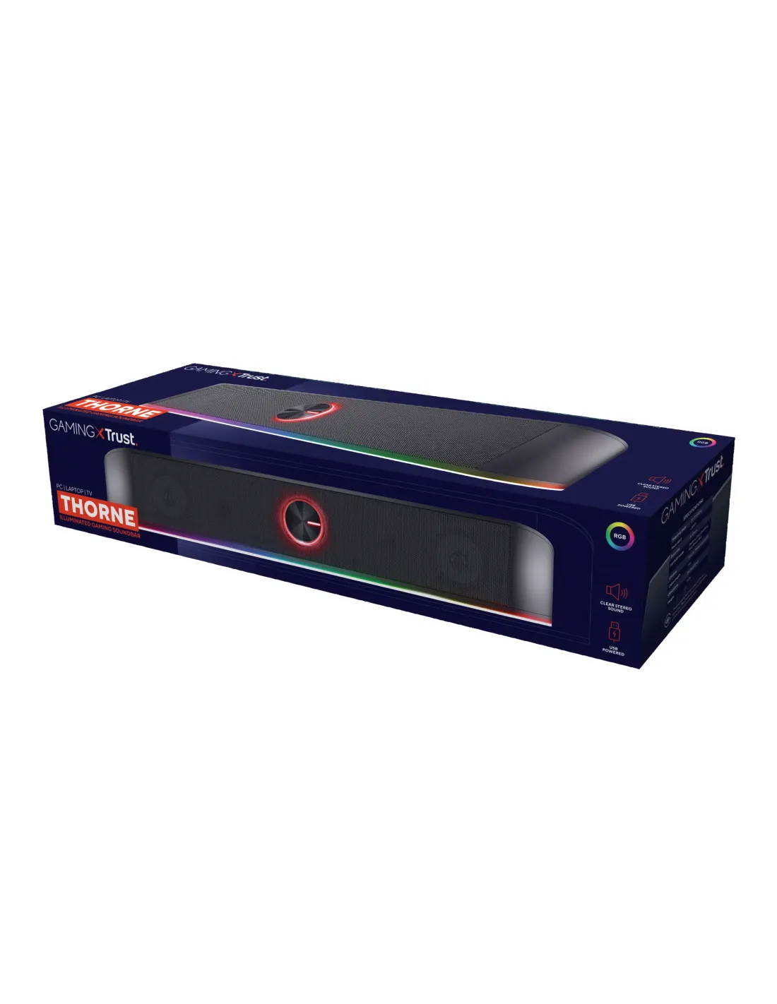Trust GXT 619 Thorne. Canales de salida de audio: 2.0 canales, Potencia estimada RMS: 6 W, Salida de pico de potencia musical (PMPO): 12 W. Potencia de la barra de sonido del altavoz RMS: 3 W, Obstrucción: 10000 Ω, Impedancia del altavoz de agudos: 4 Ω. Color del producto: Negro, País de origen: China. Tecnología de conectividad: Alámbrico. Ancho: 400 mm, Profundidad: 75 mm, Altura: 70 mm