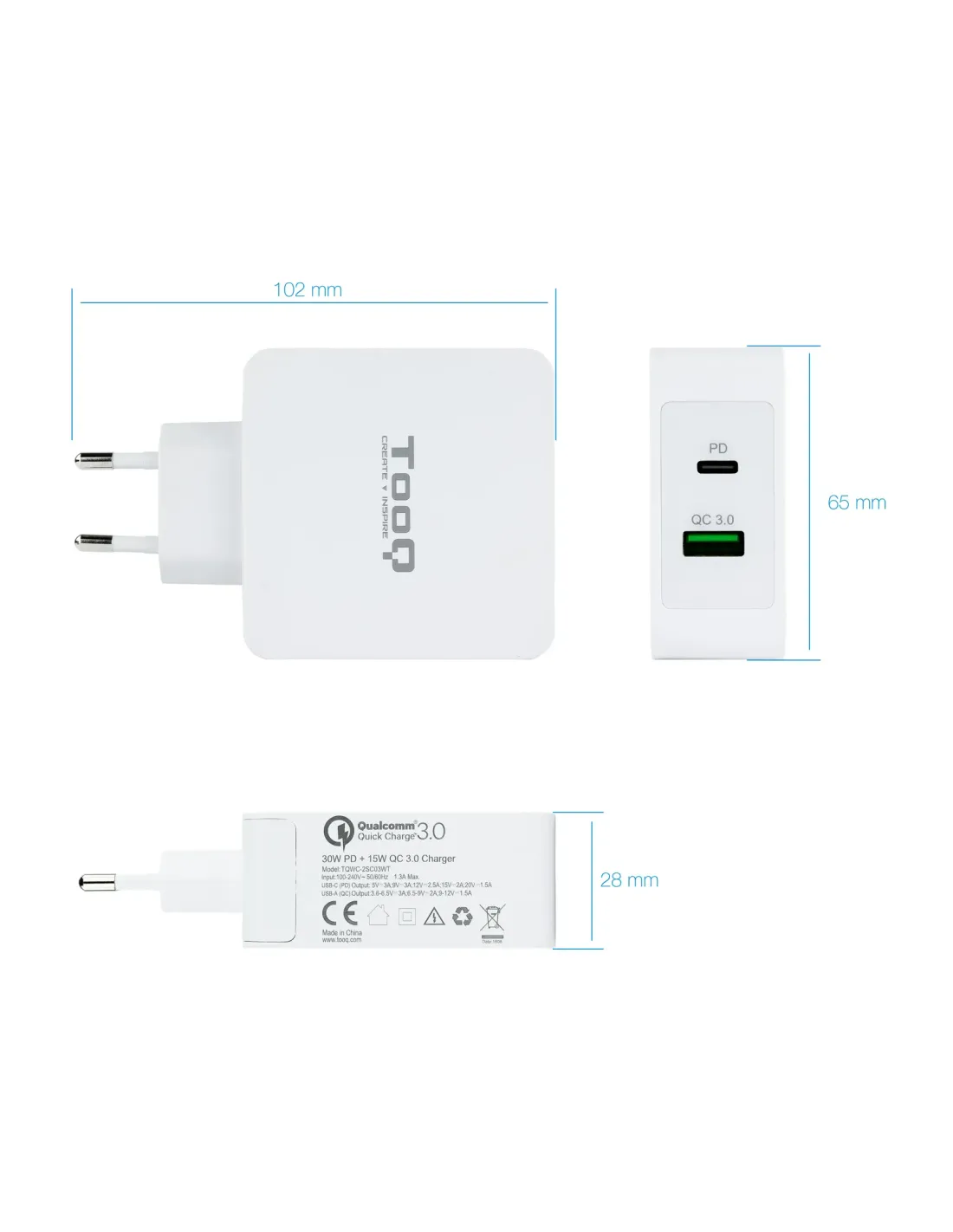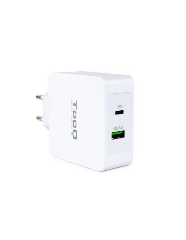 TooQ Cargador de Pared doble puerto USB-C PD + USB A QC3.0, 48W, Interior, Corriente alterna, 20 V, Blanco