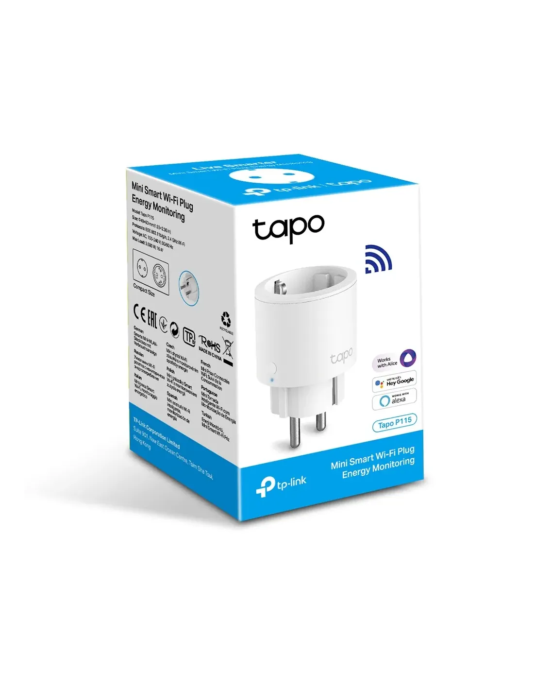 TP-Link Tapo P115. Tecnología de conectividad: Inalámbrico, Tecnología inalámbrica: Wi-Fi, Wi-Fi estándares: 802.11b, 802.11g, Wi-Fi 4 (802.11n). Colocación soportada: Interior, Color del producto: Blanco, Indicadores LED: Estado. Potencia máx. de entrada: 3680 W, Voltaje de entrada AC: 220 - 240 V, Frecuencia de entrada AC: 50/60 Hz. Ancho: 49 mm, Profundidad: 49 mm, Altura: 60 mm. Cantidad por paquete: 1 pieza(s)