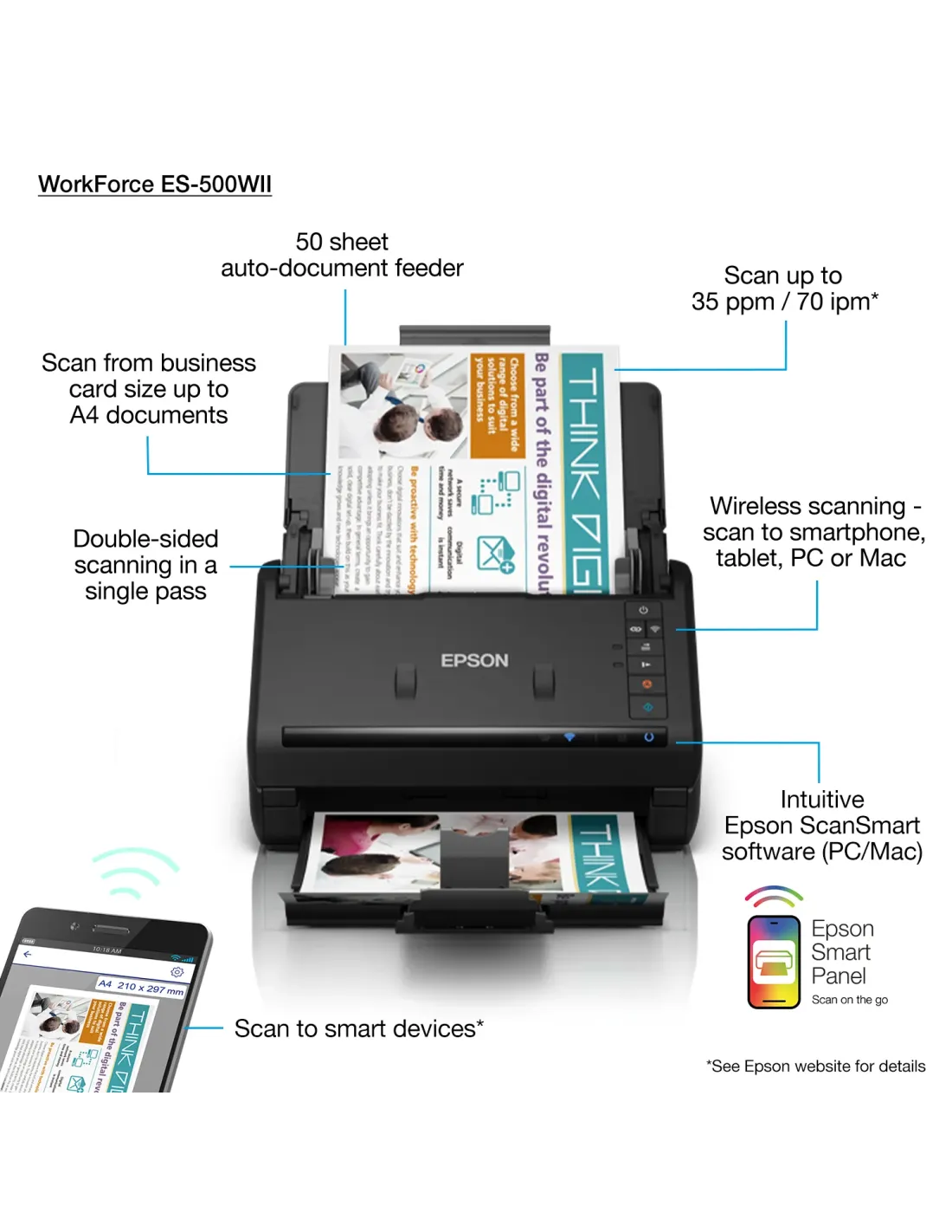 Epson WorkForce ES-500WII, 215,9 x 6069 mm, 600 x 600 DPI, 30 bit, 24 bit, 35 ppm, 35 ppm