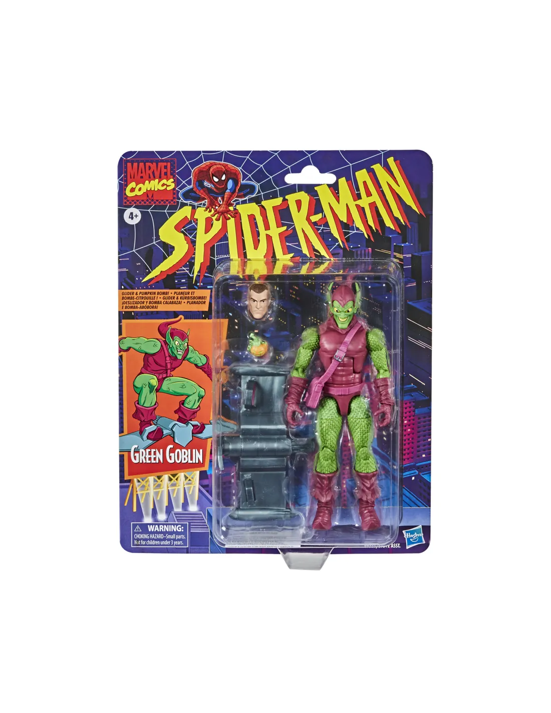 Lleva la emoción y la maravilla del Universo Marvel a tu colección con la figura del Duende Verde de Hasbro Marvel Legends. Esta figura Marvel coleccionable a escala de 15 cm está detallada para parecerse al personaje de los cómics retro Marvel's Spider-Man. Esta figura de acción del Duende Verde está totalmente articulada con un diseño premium y cabeza, brazos y piernas posables. El set de figuras de acción Marvel viene con 3 accesorios, incluyendo un planeador extraíble, una cabeza alternativa y un accesorio bomba calabaza. La escala de 15 cm de las figuras de acción Marvel de Hasbro las hace ideales para posar y exhibir en las colecciones de los fans. Reimagina escenas inspiradas en los cómics en tu estantería con las figuras de acción Marvel Legends y los coleccionables Marvel.