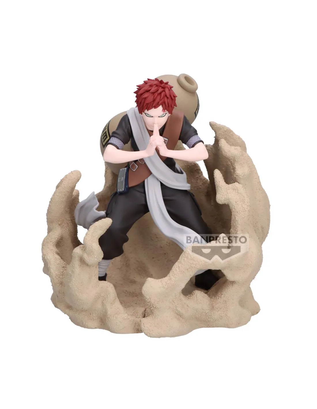 Gaara aparece con su tradicional atuendo y su característica calabaza de arena en la espalda. La figura incluye detalles como efectos de arena en movimiento y una expresión concentrada, que transmiten la intensidad de sus técnicas.