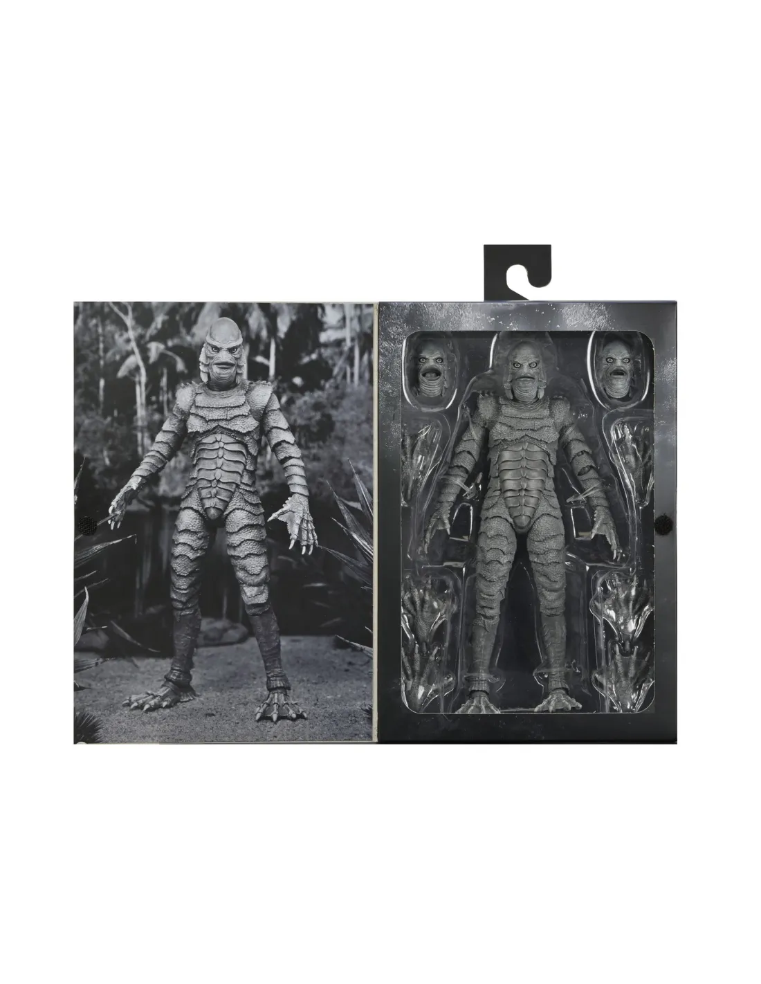 Neca presenta, dentro de la colección Universal Monsters, esta figura de Ultimamte Creature From the Black Lagon (B&,W). Mide 17,78 cm y está basada en su aparición en la película "The Creature from the Black Lagoon". Incluye 3x pares de manos y 3x cabezas intercambiables (una de ellas con mandíbula articulada). Viene en una caja con ventana con solapa frontal.