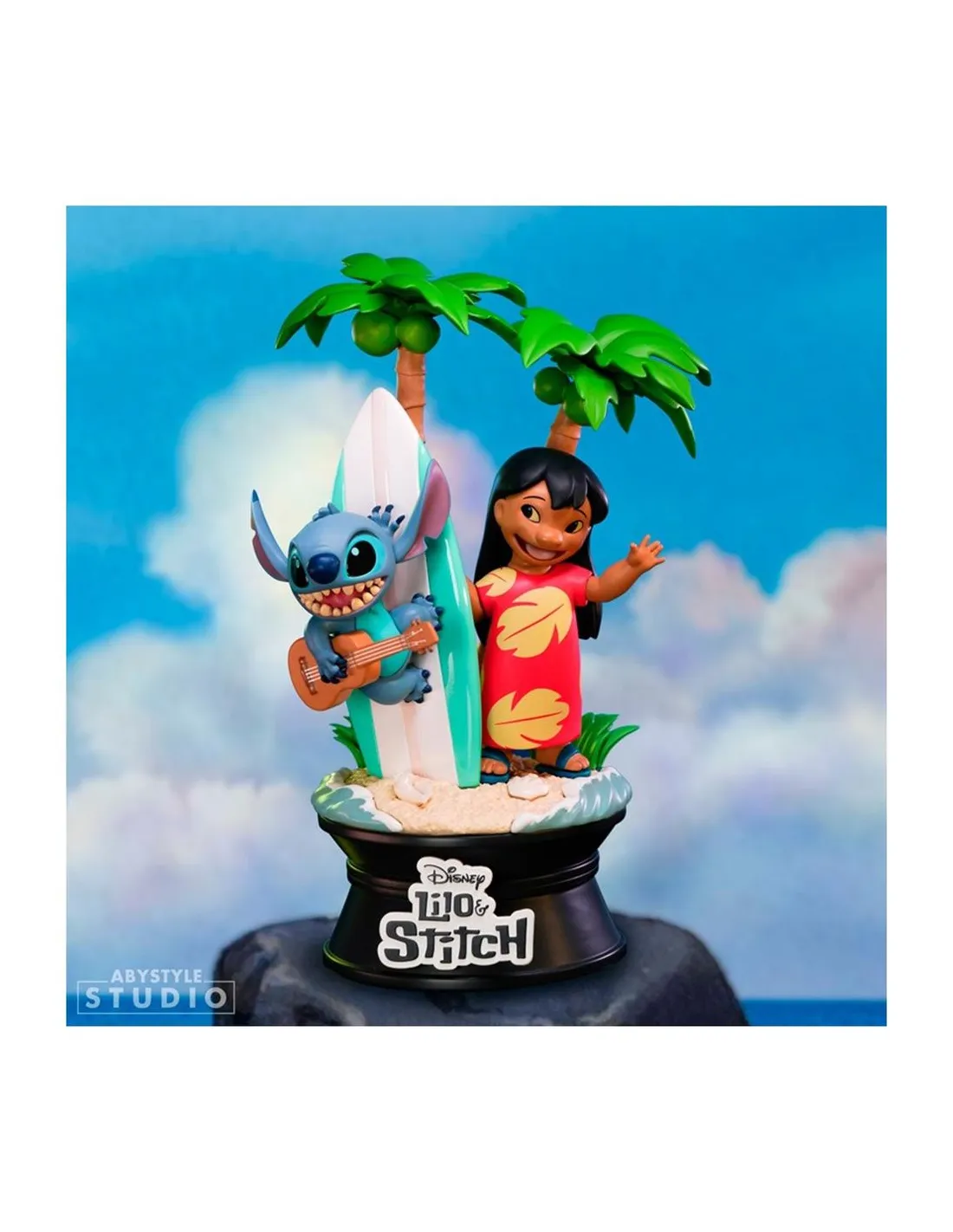 ¡Lilo y Stitch están causando sensación en la nueva colección SG+ de ABYstyle Studio! Rodeado de olas del océano y palmeras tropicales, el travieso Stitch se aferra a una tabla de surf mientras
