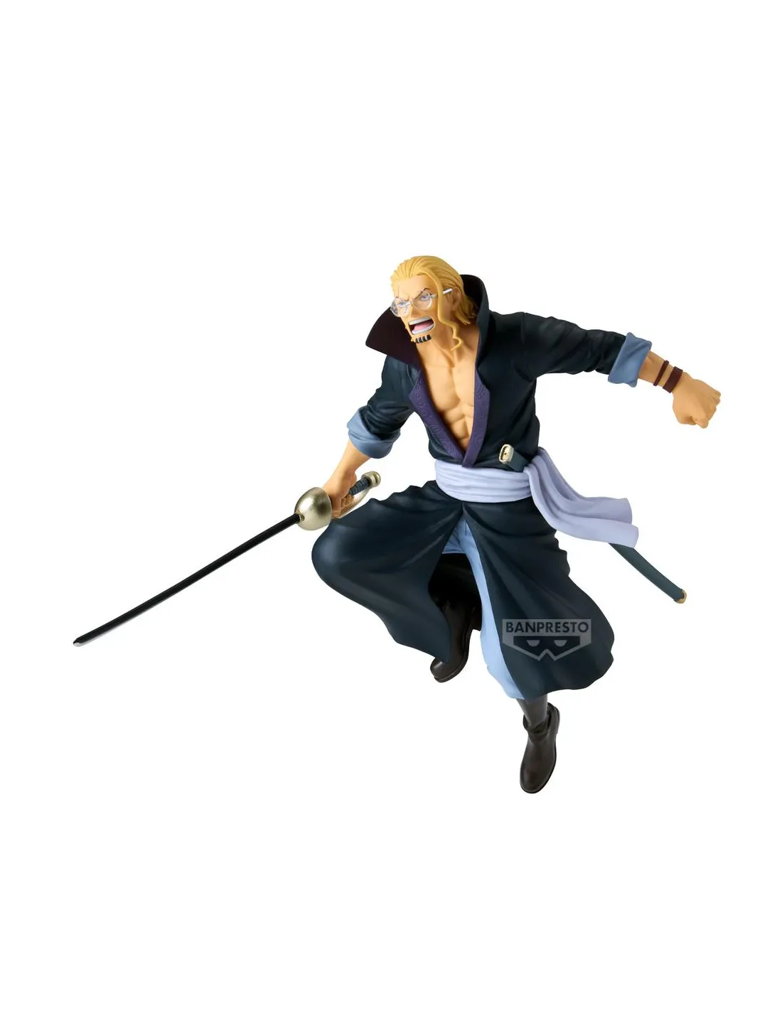 La figura está cuidadosamente modelada en una pose que captura toda la fuerza y elegancia de Silvers Rayleigh. Cada detalle, desde la expresión facial hasta el movimiento de su capa, está trabajado con precisión para ofrecer una representación fiel del personaje.