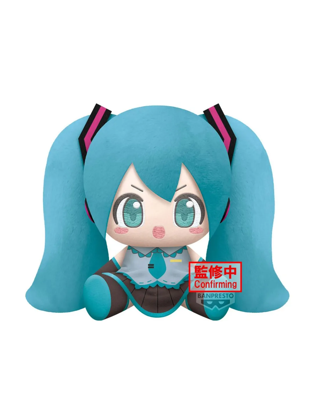 Peluche de gran tamaño inspirado en Hatsune Miku, la icónica cantante virtual de Vocaloid. Presenta su característico cabello azul turquesa en largas coletas, su atuendo clásico y una expresión adorable que captura perfectamente su estilo y personalidad.