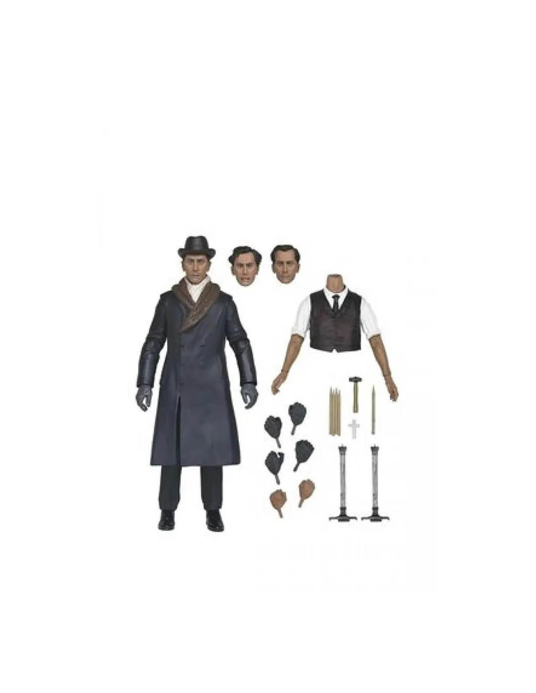 La figura de Van Helsing de la lÃnea Scale Action Figure llega a Neca con una altura de 18 cm. Está basada en el personaje de la pelÃcula de 1958 "Horror of Dracula" producida por Hammer. Contiene un torso intercambiable para mostrarlo con chaleco o abrigo, 2x cabezas extras sin sombrero, 3x pares de manos (2x pares con guantes y 1x par sin guantes), 1x martillo, 1x cruz, 1x estaca de madera, 1x haz de estacas de madera y 2x candelabros. Se presenta en una caja con ventana y solapa.