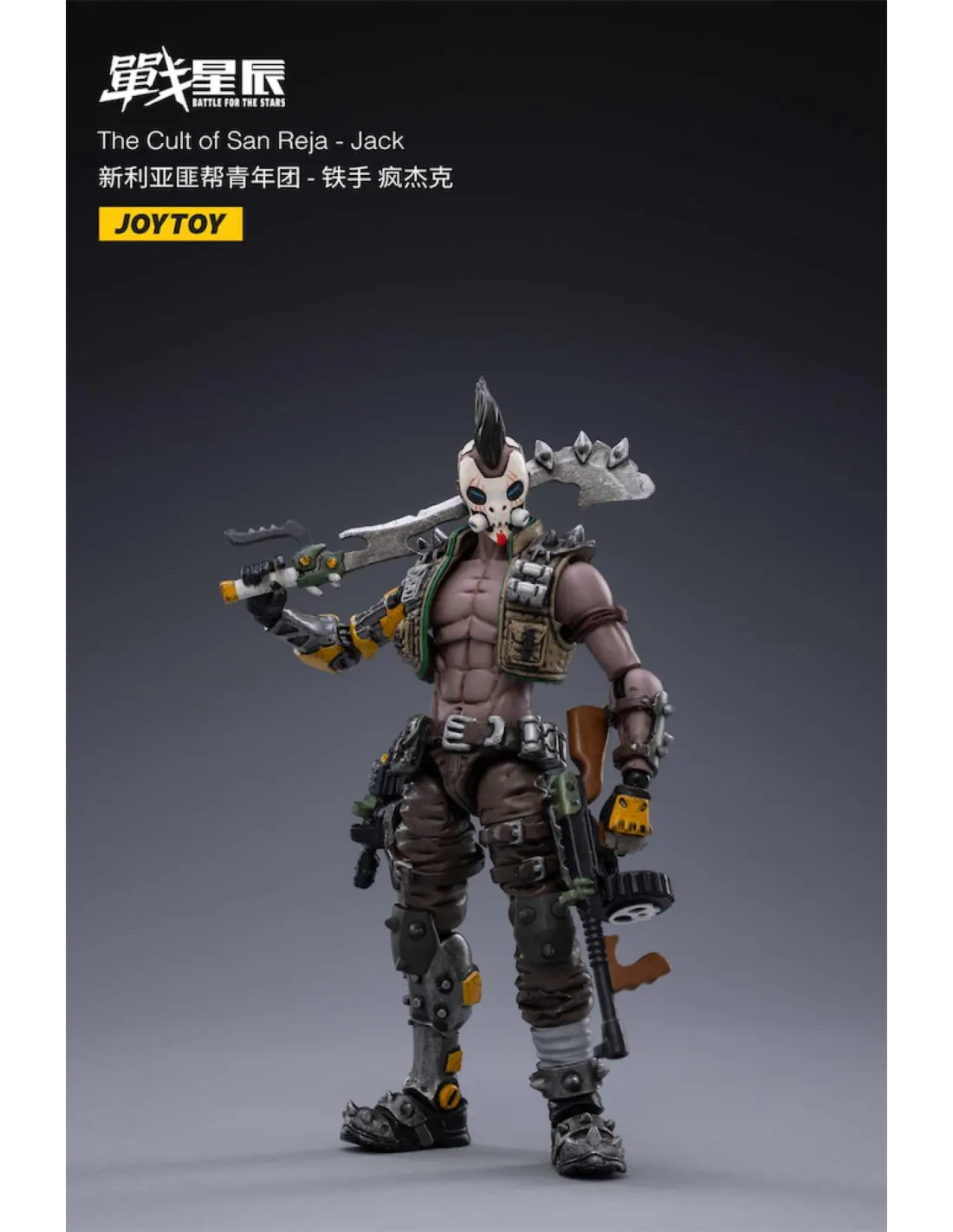 Sideshow y JoyToy se enorgullecen de presentar la serie The Cult of San Rejaen la línea Battle for the Stars de coleccionables y figuras de acción de JoyToy.Battle for the Stars es una línea de figuras de acción y vehículos a escala 1:18con temática de ciencia ficción. Las figuras estan hechas con exquisito detalley son muy articuladas para crear una variedad de escenas. The Cult of SanReja introduce nuevos aspectos en el universo de Battle for the Stars, conpersonajes y vehículos que recuerdan a la ciencia ficción caótica y la ficciónpostapocalíptica y la cultura pop como Mad Max, Chronicles of Riddick yBorderlands. Cada figura viene con una variedad de accesorios y armas. Tieneuna altura de 10.5 cm.