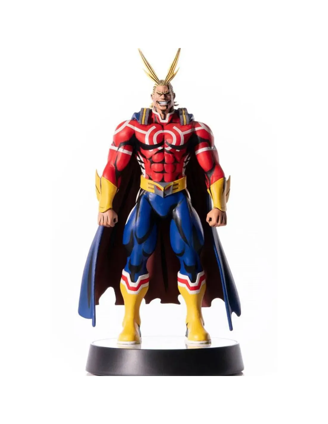 FIRST 4 FIGURES presenta la versión standard de la figura de All Might de"My Hero Academy". La figura esta basada en su apariencia en la llamadaEdad de Plata concretamente en el juguete favorito de Izuku con el quejugaba siempre en su infancia.La figura cuenta con brazos articulados, esta hecha en PVCy se encuentra sobre una fuerte base circular magnetizada con el logo deMy Hero Academia. Viene en una caja de coleccionista con fondo dediorama e incluye folleto F4F con 500 puntos de recompensa F4F.