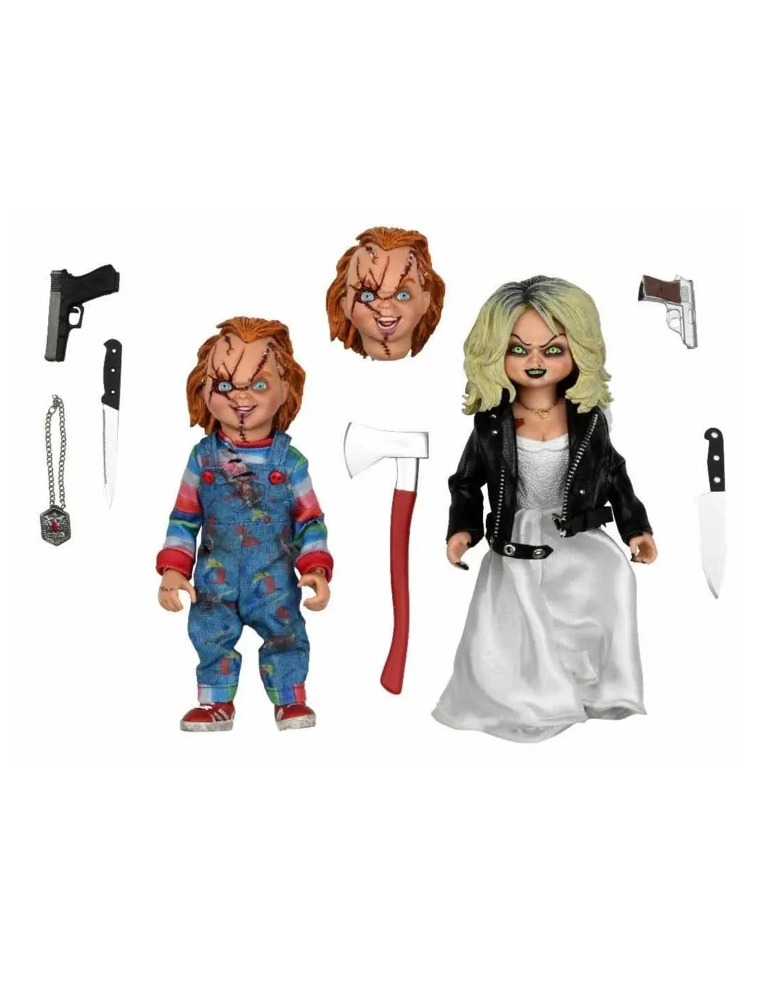 Neca nos presenta este set de 2 figuras de Chucky y Tiffany basados en los personajes de "la Novia de Chucky". Las figuras miden 20 cm aproximadamente de alto y son totalmente articuladas Llevanropa de tela y un monton de accesorios: una cabeza adicional intercambiable para Chucky, dos cuchillos, dos pistolas, un hacha y un collar.