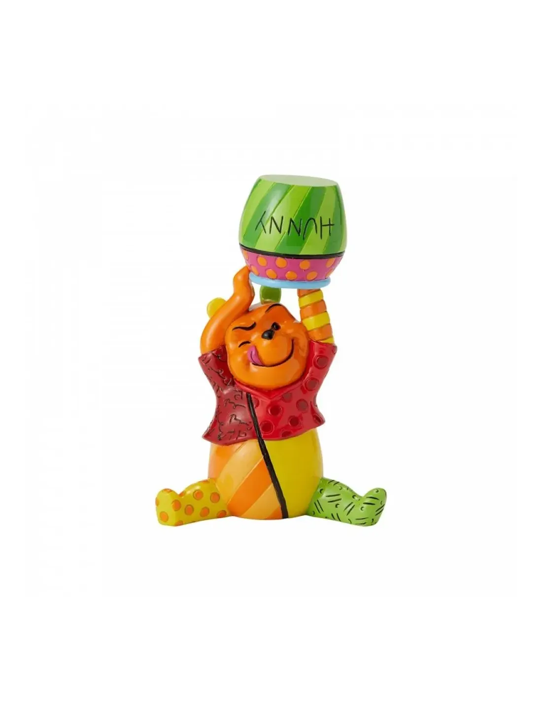 Winnie se reinventa con colores brillantes y patrones geométricos. Observe al gentil oso en su hábitat natural, en una búsqueda interminable para llenar su barriga de miel. Cada figura de Disney by Britto,decorada en un estilo pop art por el artista internacional Roméro Britto, "Es resina pintada a mano con un acabado lacado y brillante. Empaquetado en una caja de regalo. Estas figuras no son juguetespara niños. Destinadas únicamente a adultos.
