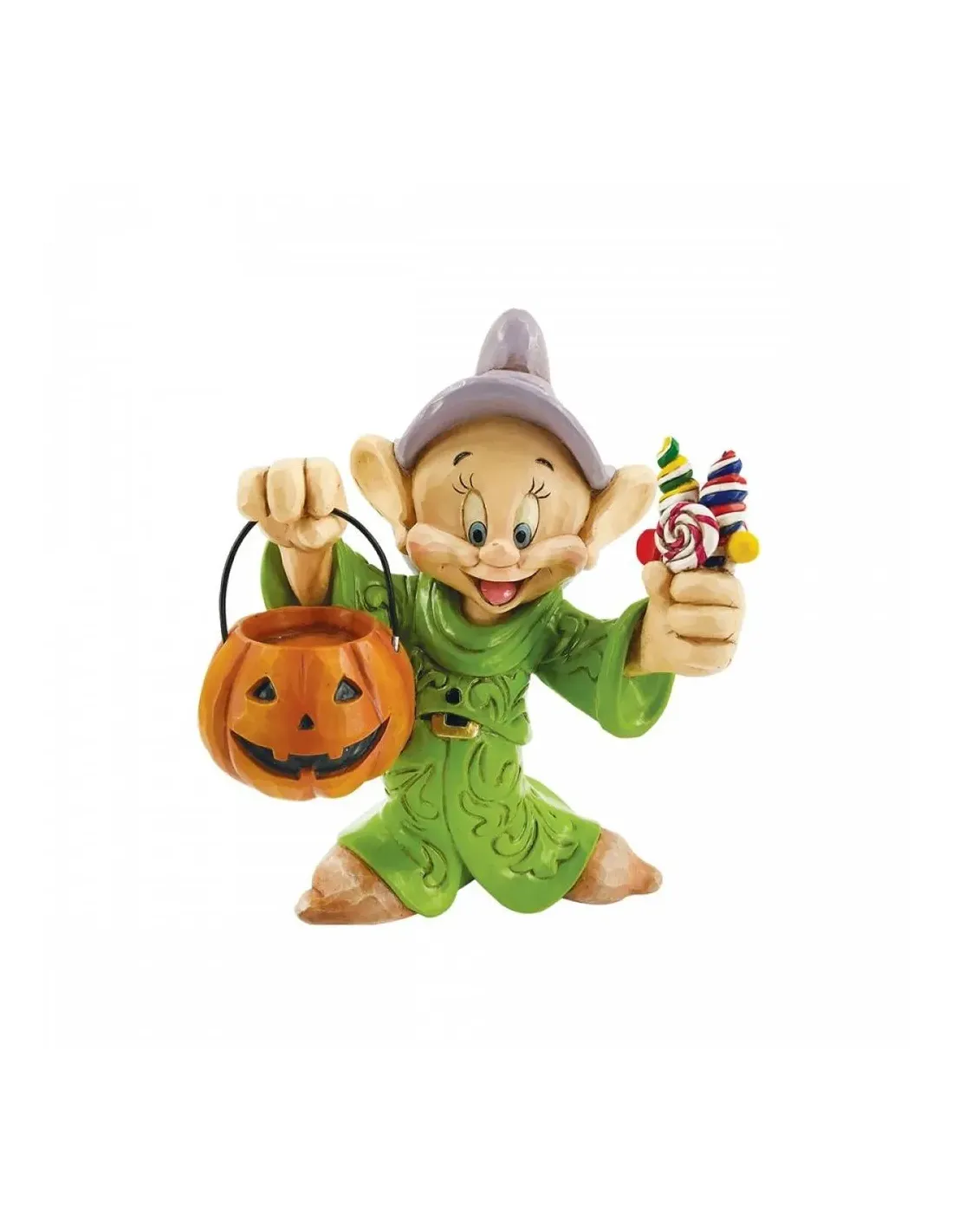 Dopey, el más joven de los Siete Enanitos, se pone un sombrero de mago y un cubo de dulces para Halloween. Con una gran sonrisa y su atuendo holgado, está listo para una temporada de golosinas ybuen humor en este clásico de Halloween de Jim Shore. Estas figuras no son juguetes para niños. Destinado únicamente a adultos.