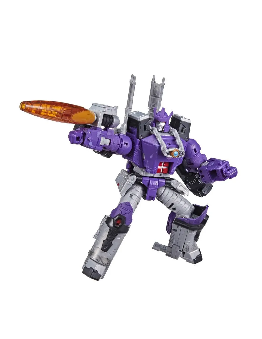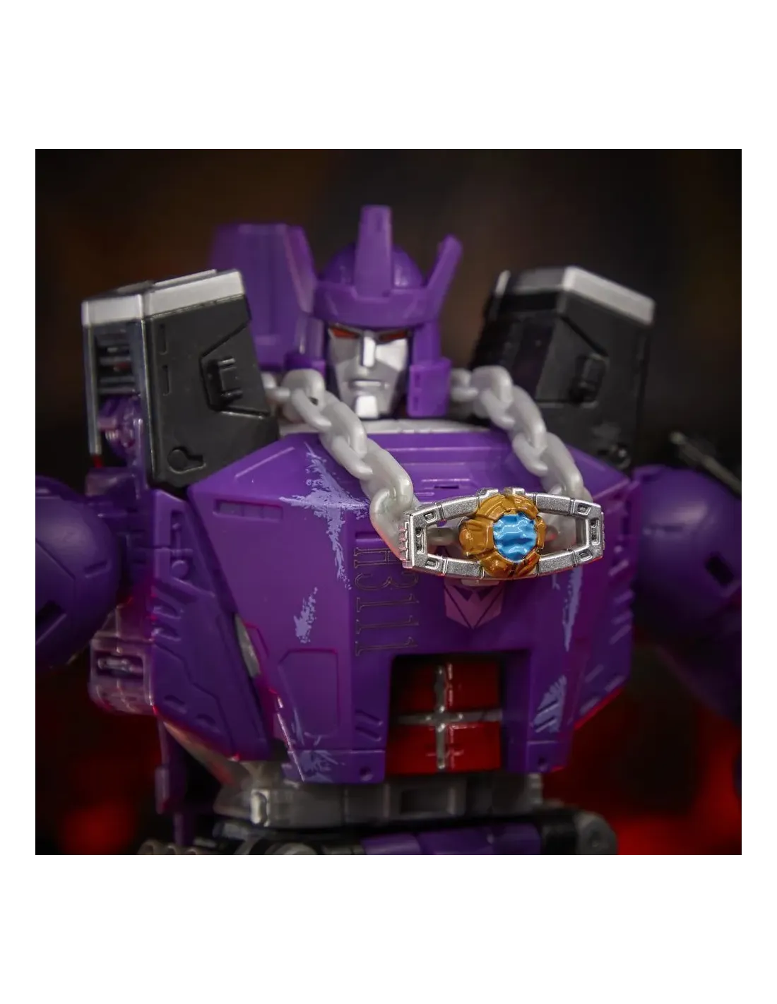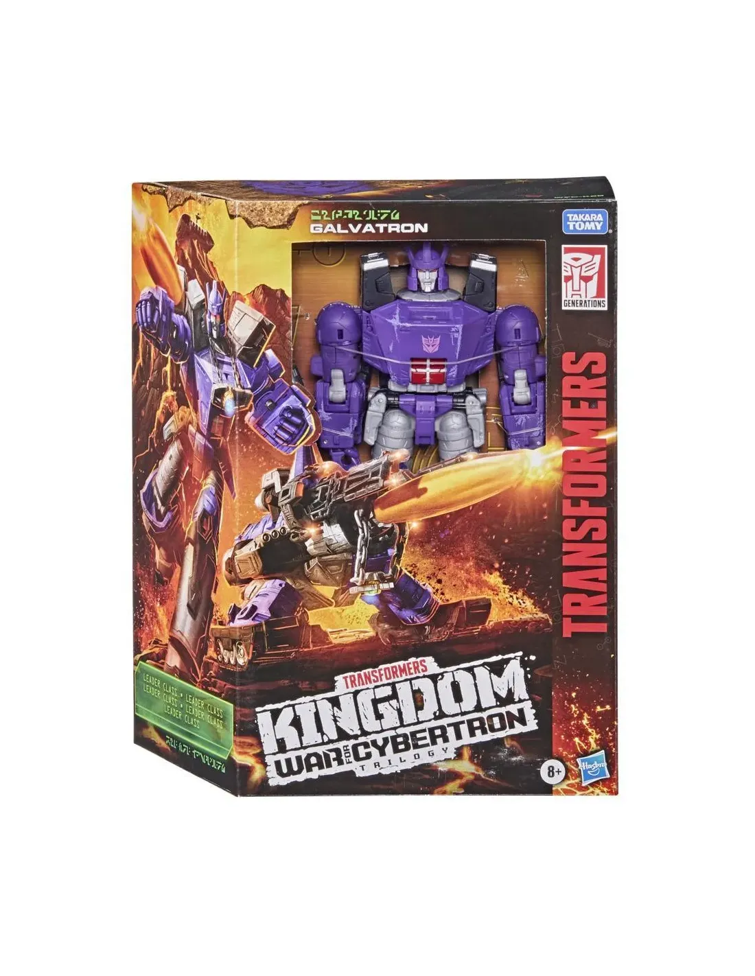 Hasbro presenta dentro de la colecciÛn Generations WFC Deluxe la figuradel lÌder decepticon Galvatron en su versiÛn Kingdom Leader Class. Setrata de una figura articulada transformable en 33 pasos en un tcaÒÛngal·ctico. Est· hecha en PVC y mide unos 18 cm de alto. Incluye armas ycomplementos para personalizar la figura y el vehÌculo, que a su vezpermiten aÒadir accesorios de armas personalizadas asÌ como efectos(*se venden aparte).
