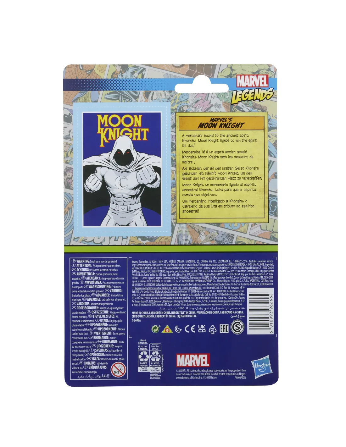 Hasbro Fans presenta la figura de Moon Knight, el caballero Luna de lacolecciÛn Marvel Legends Retro. Caballero Luna, un mercenario ligado alespÌritu ancestral Khonshu, lucha para que el espÌritu cumpla sus objetivos.La figura mide 9.5 cm.