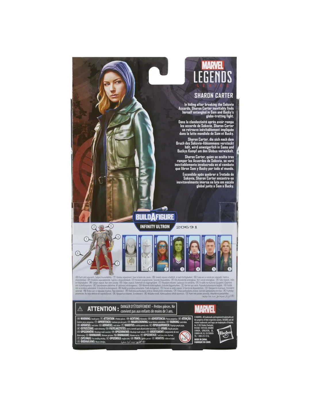 Sharon Carter, quien se oculta tras romper los Acuerdos de Sokovia, severá inevitablemente involucrada en el combate que libran Sam y Buckypor todo el mundo.Esta figura de Sharon Carter está inspirada en la apariencia del personajede Marvel Studios en Falcon y el Soldado de Invierno, de Disney Plus