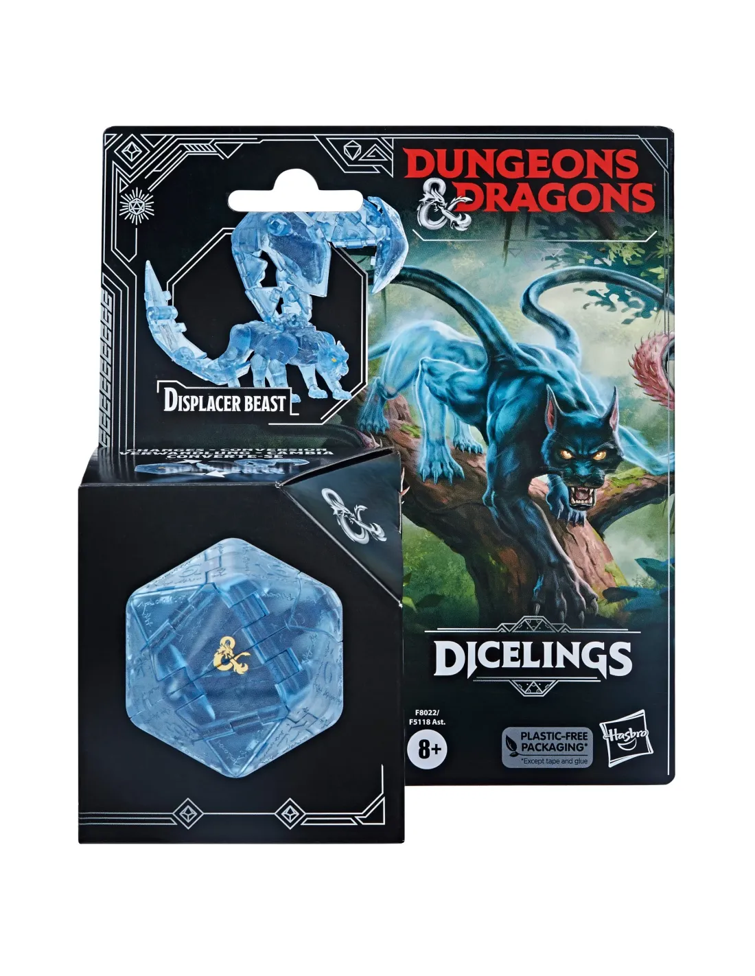 ¡Conversión D&,D! Ten cuidado con la bestia desplazadora, uno de los incontables monstruos que habitan en los reinos de Dungeons & Dragons. Ahora puedes coleccionar un nuevo tipo de figura de acción con los Dicelings: ¡una figura que puedes convertir de dado d20 gigante en monstruo y viceversa!