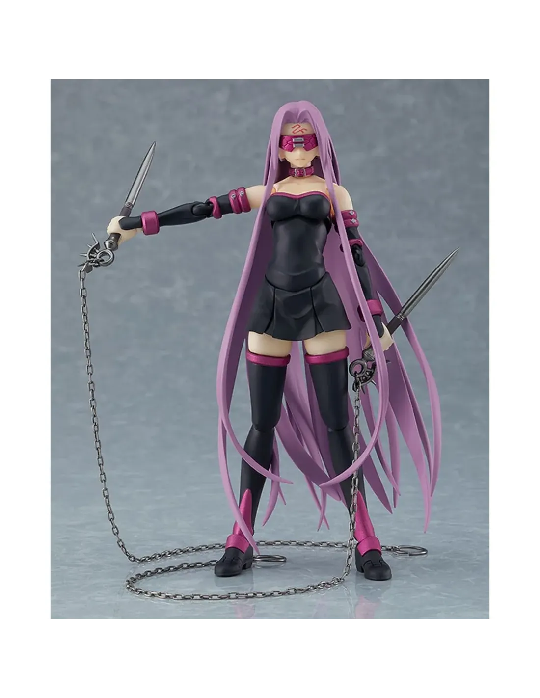 Good Smile Company presenta la figura Figma de Rider de Fate/Stay Night. Setrata de una figura hecha en PVC de unos 15 cm de alto. Viene con tresplacas faciales: una cara inexpresiva, una cara con los dientes apretados yuna cara sonriente. Su máscara que oculta sus ojos místicos se puede quitarpara revelar un lado diferente de Rider. Sus armas Rider Dagger estánincluidas en versiones de cadena y versiones de PVC esculpidas para queparezcan en movimiento. Se incluye un soporte de figma articulado paramostrar la figma en una variedad de poses.