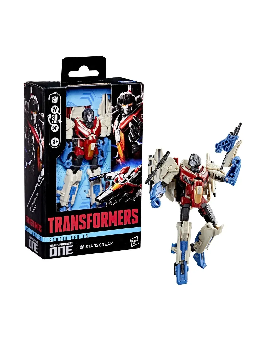 Características de la Figura Hasbro Starscream Studio Series Transformers One 11,5 cmLa figura de acción **Starscream Studio Series Transformers One** está diseñada para los fans que buscan una representación fidedigna del universo Transformers. Con un diseño detallado inspirado en la película animada, esta figura de 11,5 cm de alto permite recrear escenas icónicas y disfrutar de una experiencia de juego o coleccionismo dinámica.Conversión clásica en 30 pasosGracias a su sistema de conversión avanzada, Starscream se transforma de robot a **tetra jet cybertroniano** en 30 pasos, manteniendo la fidelidad al personaje y ofreciendo una experiencia fluida tanto para juego como para exhibición.Transformación detallada con 30 movimientosModos: robot y tetra jet cybertronianoMecánica inspirada en el universo originalAccesorios incluidos y posabilidadLa figura incluye **dos láseres anuladores** que se pueden fijar en ambos modos de transformación, aportando versatilidad y un toque adicional de realismo. Su tamaño compacto y los puntos de articulación hacen que sea ideal tanto para exhibir como para jugar.Incluye 2 láseres anuladores desmontablesCompatible con ambos modosAltura: 11,5 cm