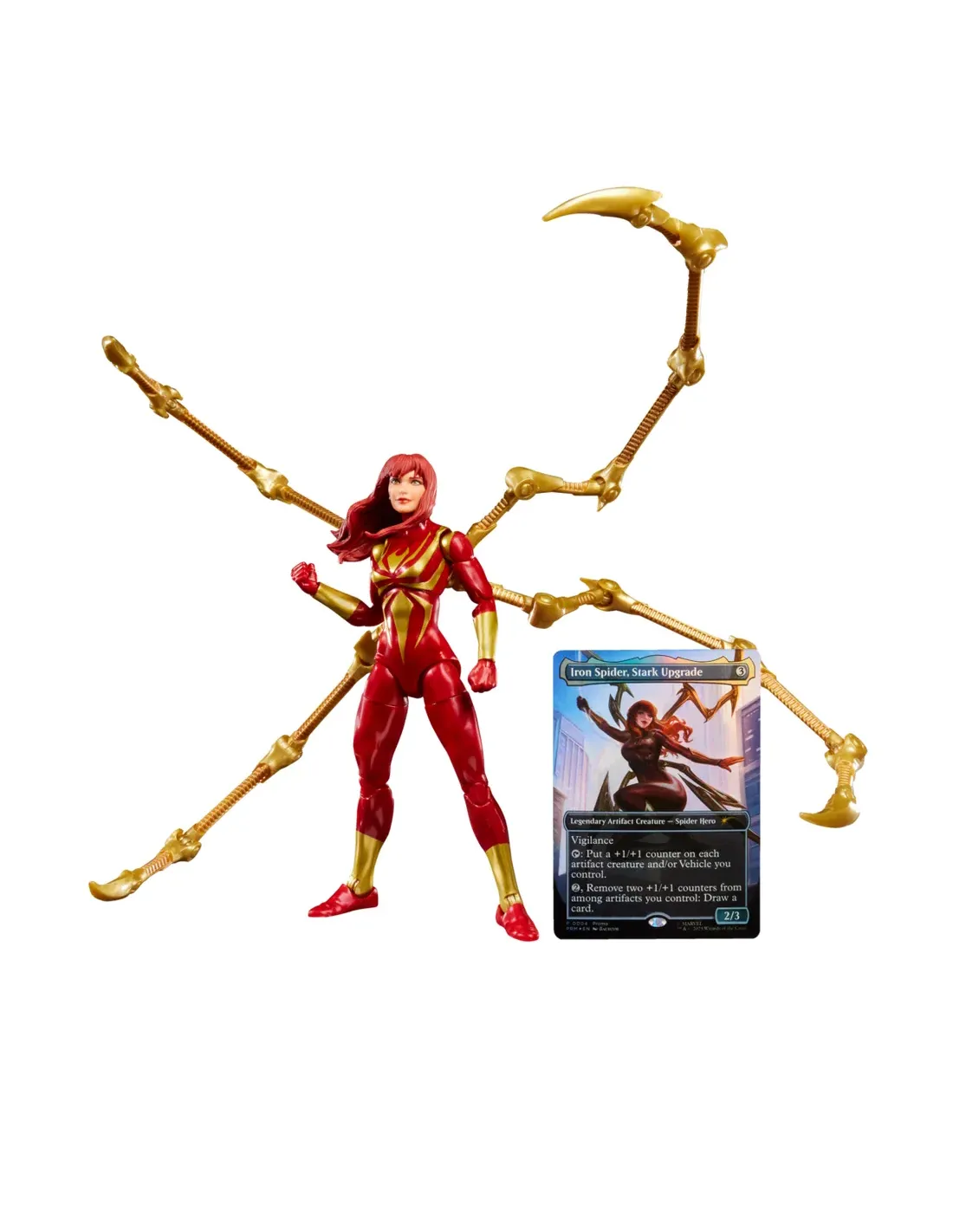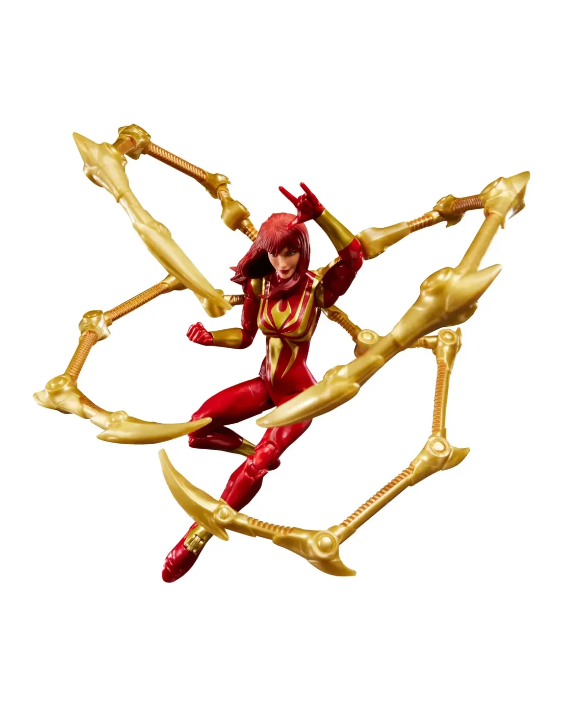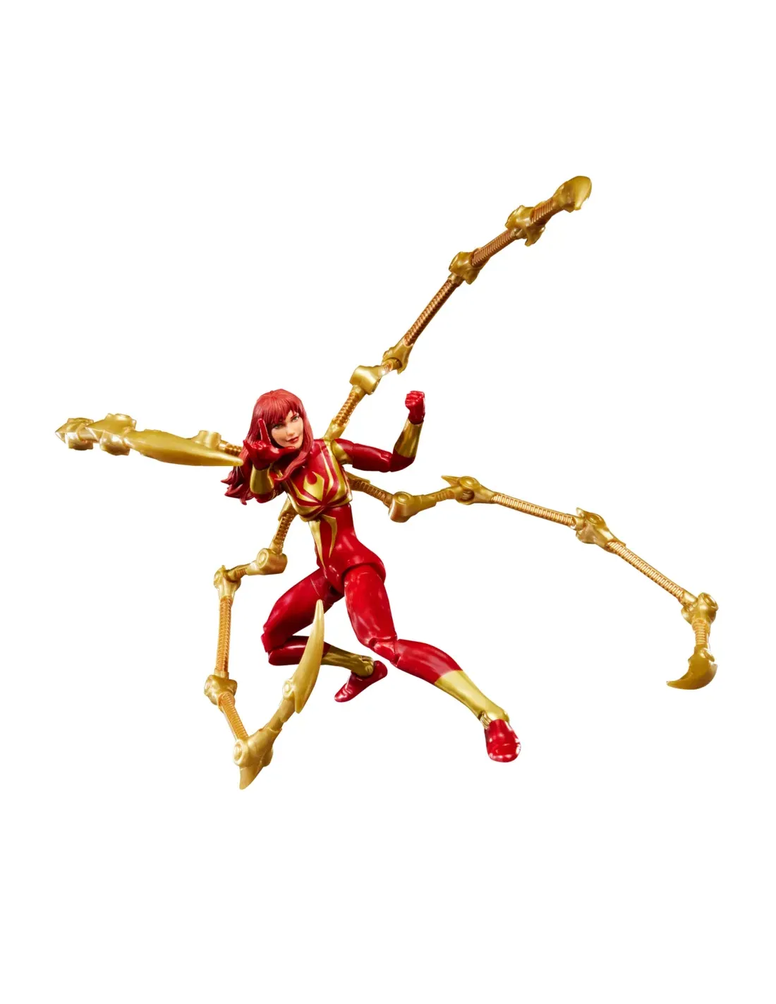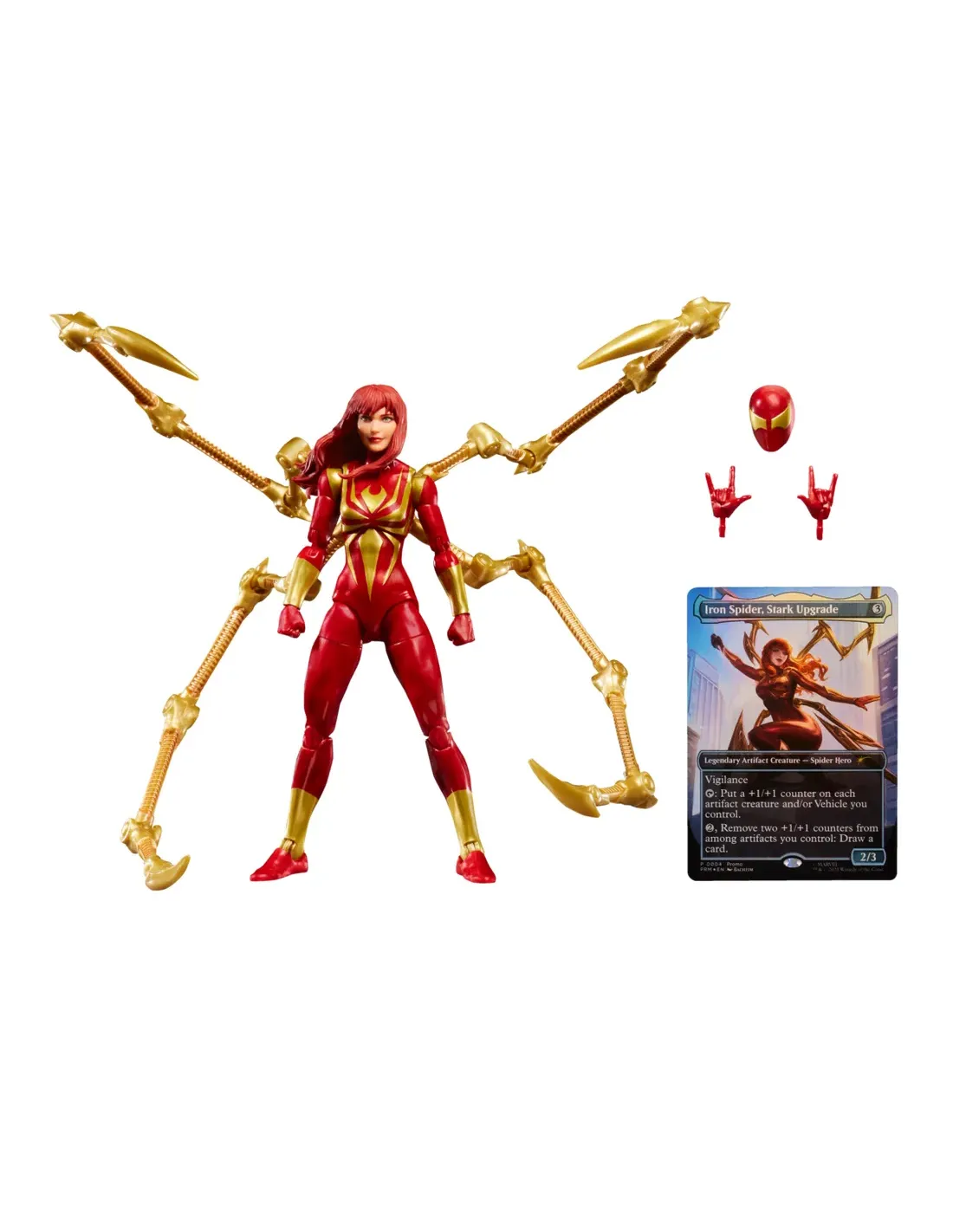 Características de Mary Jane Watson (Iron Spider) Marvel Legends Magic: The GatheringLa figura de Mary Jane Watson en el traje Iron Spider combina dos universos legendarios: el de Marvel y el de Magic: The Gathering. Este coleccionable premium rinde homenaje al momento en que Mary Jane, el gran amor de Peter Parker, se enfunda la armadura tecnológica diseñada por Tony Stark. El resultado es un artículo único, perfecto tanto para coleccionistas de Marvel Legends como para jugadores de cartas de Magic: The Gathering.Diseño icónico del Iron SpiderEl traje rojo y dorado con patas mecánicas desplegables refleja la determinación de Mary Jane unida a la ingeniería de Stark Industries. La figura reproduce con detalle este diseño, ofreciendo un acabado metálico realista y una gran fidelidad a los cómics.Escala de 6 pulgadas (15 cm)Acabados premium en rojo metálico y doradoInspiración directa en la versión cómic del personajeArticulación y accesorios intercambiablesCon más de 20 puntos de articulación, la figura permite recrear tanto escenas de acción como de compañerismo heroico. Además, incorpora accesorios que amplían sus posibilidades de exhibición.Cabeza alternativa con el rostro de Mary Jane WatsonCabeza enmascarada intercambiableDos manos "thwip" para poses de acciónCuatro patas doradas desmontables tipo arácnidoPresentación en caja con ventana ilustradaCruce con Magic: The GatheringEste set incluye una carta exclusiva de Magic: The Gathering, titulada Iron Spider, Stark Upgrade. Se trata de una carta jugable, con efectos especiales vinculados a la temática de artefactos y vigilancia, lo que convierte a este pack en una pieza singular para dos comunidades de coleccionistas.Carta exclusiva Iron Spider, Stark UpgradeTotalmente jugable en Magic: The GatheringDiseño inspirado en la figuraEl legado de Mary Jane en tu colecciónMary Jane Watson siempre ha simbolizado la fuerza emocional en la historia de Spider-Man. Con este set, asume también el papel de heroína en armadura, ofreciendo a los coleccionistas una pieza que representa tanto su importancia narrativa como su evolución en el multiverso Marvel.Otras especificacionesMarca: Marvel Legends SeriesColaboración: Magic: The GatheringAltura: 15 cm (escala 6")Articulaciones: 20+ puntosMaterial: Plástico de alta calidad con acabados metálicos
