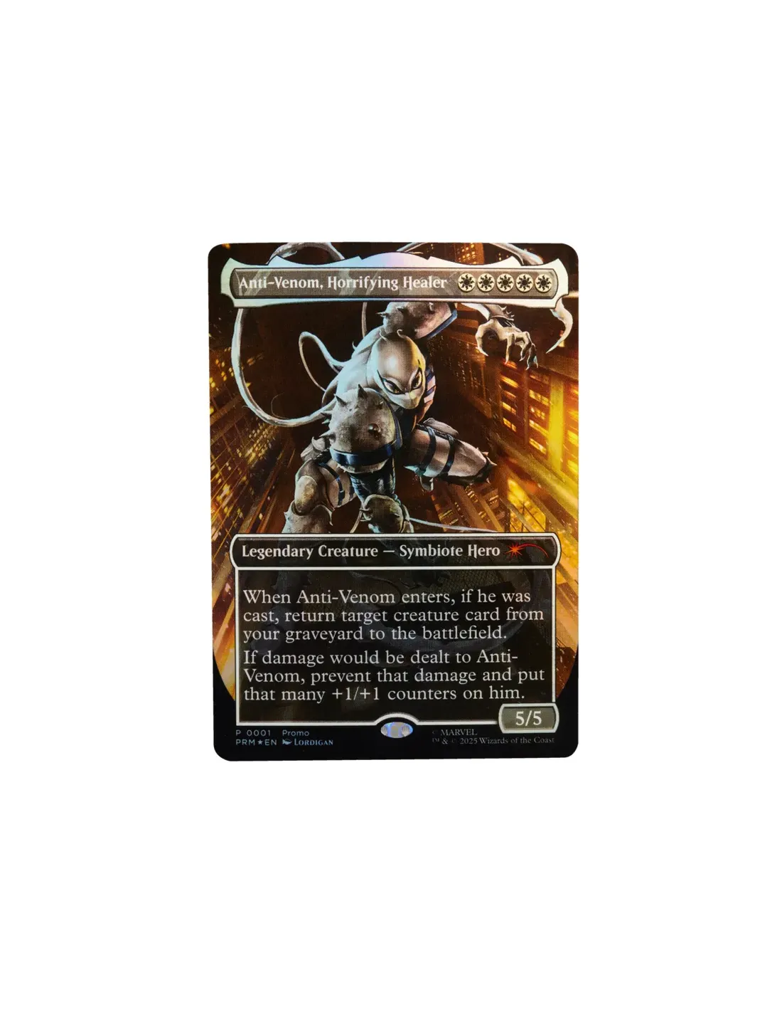 Características de la figura Agent Anti-Venom Marvel Legends Magic: The GatheringLa figura Agent Anti-Venom Marvel Legends, fruto de la colaboración entre Hasbro y Magic: The Gathering, representa una de las transformaciones más icónicas de Flash Thompson. Este exsoldado, que pasó de ser Agent Venom a asumir una nueva identidad gracias al suero antiveneno, se convierte en un antihéroe capaz de purgar simbiontes con un solo toque. La edición combina la fuerza narrativa de los cómics de Spider-Man con la innovación de un set de coleccionismo que une figura articulada y carta exclusiva.Diseño fiel al personajeEl aspecto de Agent Anti-Venom está cuidadosamente reproducido en una figura de 15 cm, capturando tanto la brutalidad del simbionte como el simbolismo de su redención. El contraste entre la armadura blanca y el emblema arácnido negro refuerza la dualidad del personaje.Esculpido detallado con hombreras tachonadas y texturas de armadura.Zarcillos acoplables en la espalda para simular el poder simbiótico en acción.Pintura de alta precisión que resalta cada detalle.Accesorios para una experiencia completaHasbro incluye 14 accesorios que enriquecen la experiencia de colección, permitiendo recrear escenas de combate y poses dinámicas.5 pistolas en plástico translúcido azul con efectos intercambiables de disparo y humo verde neón.Zarcillos simbióticos de cuatro prolongaciones para la espalda.4 manos alternativas para variar entre lucha cuerpo a cuerpo o posturas tácticas.Más de 20 puntos de articulación para un posado fluido y realista.Un cruce único con Magic: The GatheringEl set incorpora una carta foil exclusiva: Anti-Venom, Horrifying Healer. Sus habilidades permiten devolver criaturas del cementerio y fortalecerse con el daño recibido, reflejando la esencia del personaje como sanador letal y verdugo simbiótico. Esto convierte la edición en un híbrido único entre coleccionismo de figuras y estrategia de cartas.Una pieza central para coleccionistasLa figura Agent Anti-Venom Marvel Legends Magic: The Gathering no es solo un artículo de colección, sino también un fragmento de la historia moderna de Marvel. Con su presencia imponente y su estética blanca, se convierte en el elemento central de cualquier vitrina arácnida, uniendo lo mejor de los universos cómic y TCG.Otras especificacionesAltura: 15 cm.Fabricante: Hasbro.Línea: Marvel Legends.Incluye carta foil exclusiva de Magic: The Gathering.