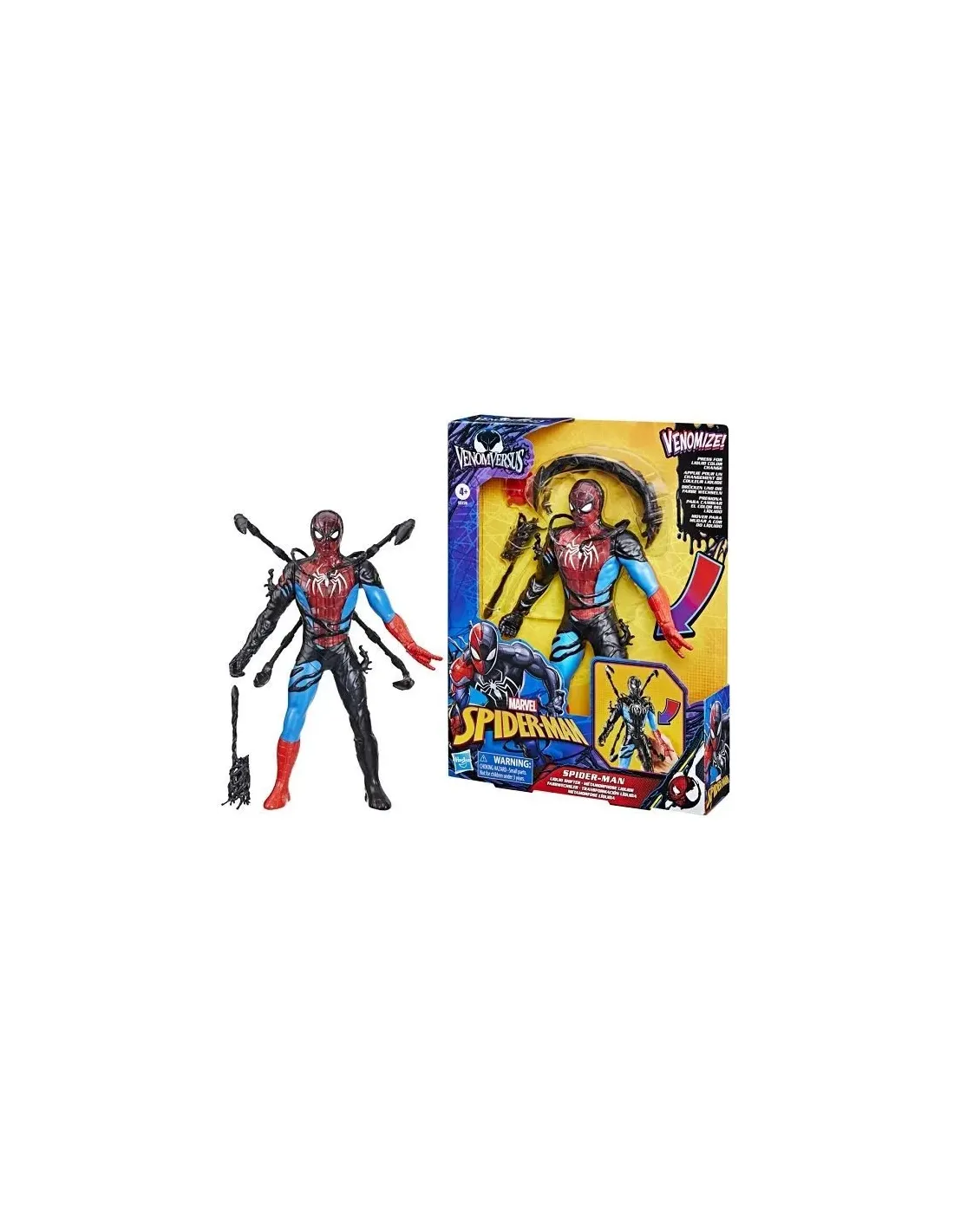 Figura de 28 cm con función de intercambio de fluidos. ¡Transforma tu figura de Spider-Man en un Spider-Man envenenado con un apretón de manos de Spider-Man!? Incluye garras de Venom y un accesorio para la mano.? Recomendación de edad 4+ años.