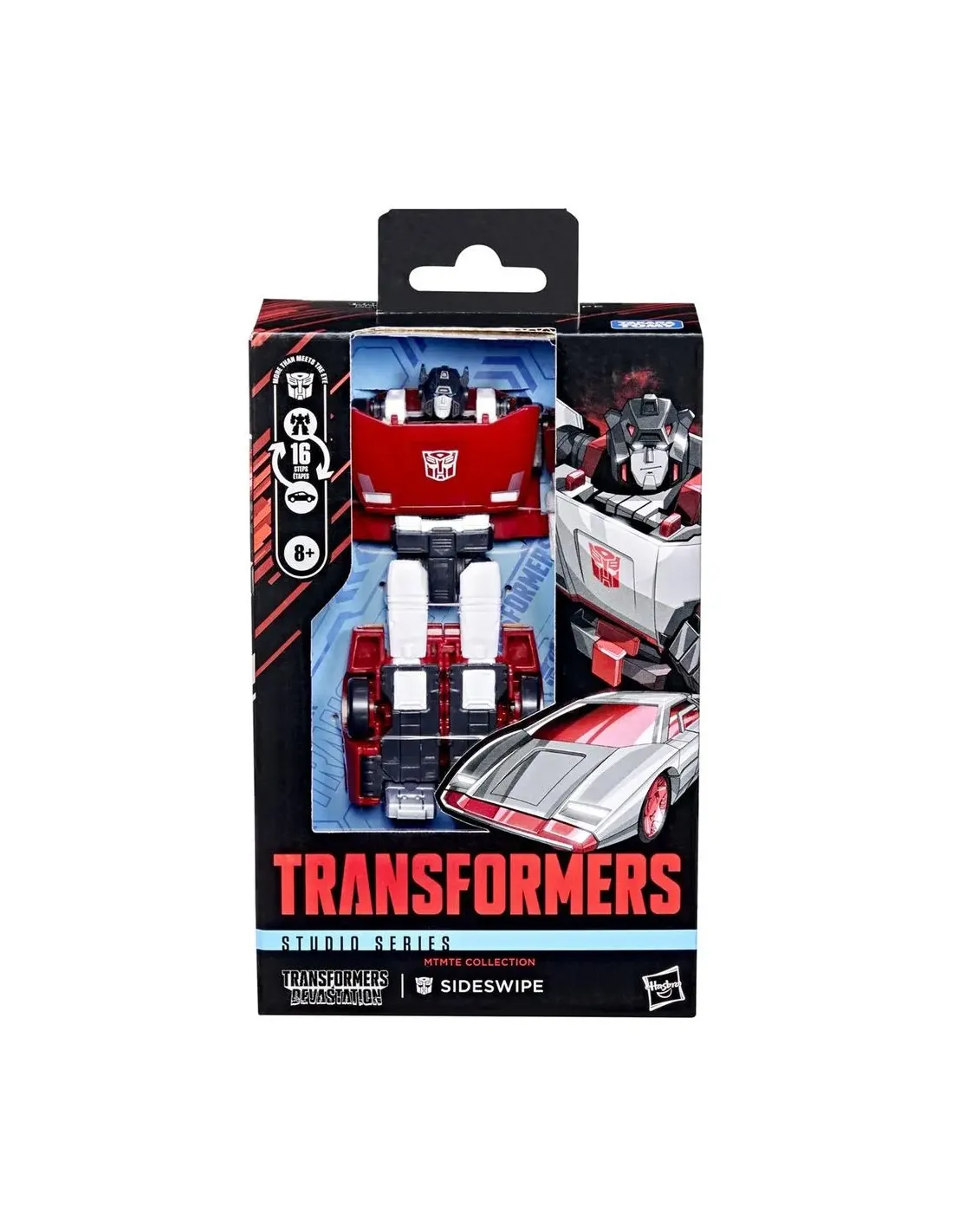 -COLECCIÓNTransformers Studio Series - MTMTE Collection-PERSONAJESideswipe, basado en su aparición en el videojuego "Transformers: Devastation".-TRANSFORMACIÓNSe convierte de robot a coche en 16 pasos, permitiendo una experiencia de juego dinámica y detallada.-ARTICULACIÓN Y ACCESORIOSFigura articulada de 11 cm que incluye 1 cohete de hombro y 1 cañón, ambos compatibles con los dos modos de transformación.-PRESENTACIÓNEmpaquetado en caja ilustrada con ventana, ideal tanto para juego como para exhibición.
