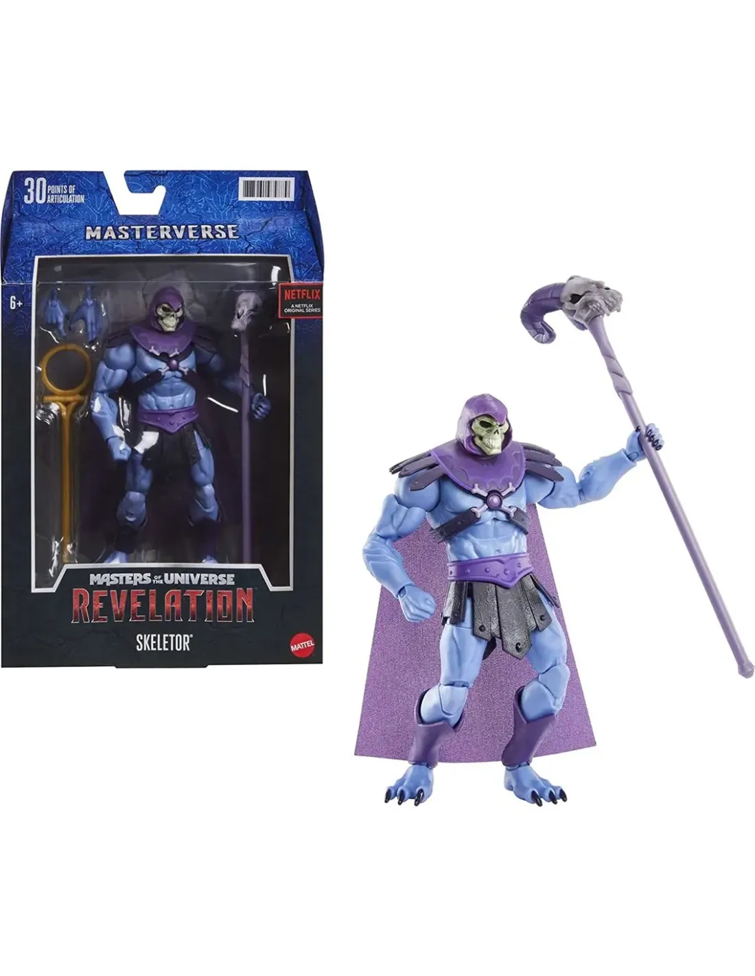 Mattel presenta la nueva colección de figuras para la serie infantil deNetflix "He-man and the Masters of the Universe". Se trata de unaactualización de la licencia de este mundo ficticio de Sword & Sorcery ySciFi. Un nuevo diseño de personajes e indumentarias. En esta ocasión setrata de la figura de Skeletor. Está hecha en PVC y mide unos 18 cm.