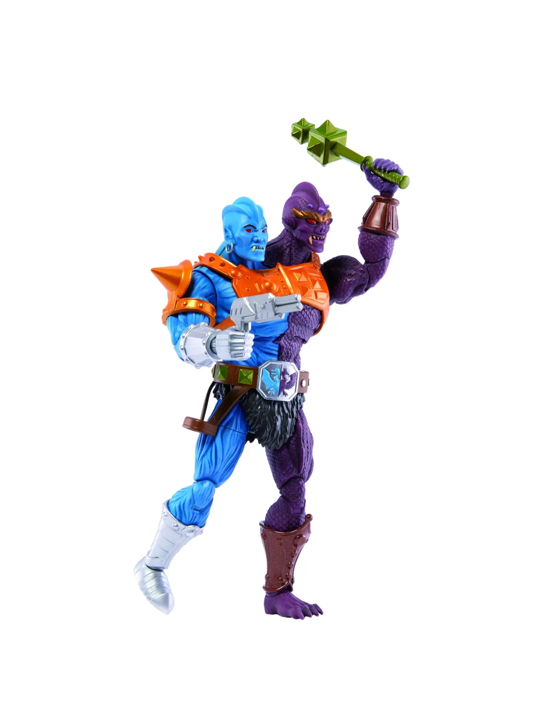 La figura de acción del Masterverso Two Bad da vida al villano de Masters of Universe con un tamaño de 20 centímetros y un ancho de 12,7 centímetros. Con más de 30 puntos de movimiento y grandesdetalles como palos, un hacha, un escudo, un bláster y manos y cabezas intercambiables, es perfecto para recrear emocionantes escenas de acción. El cinturón con funda, así como el brazo y la corazase pueden quitar.