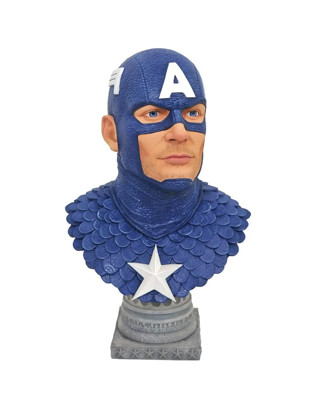 Diamond Select Toys presenta el busto de Capitán América, para lacolección Legends in 3D Marvel Comics. Se trata de un busto de unos 25 cmde alto hecho en resina, diseñado por Joe Allard y esculpido por RoccoTartamella. Es una edición limitada a 1000 unidades numeradasmanualmente, e incluye un certificado de autenticidad.