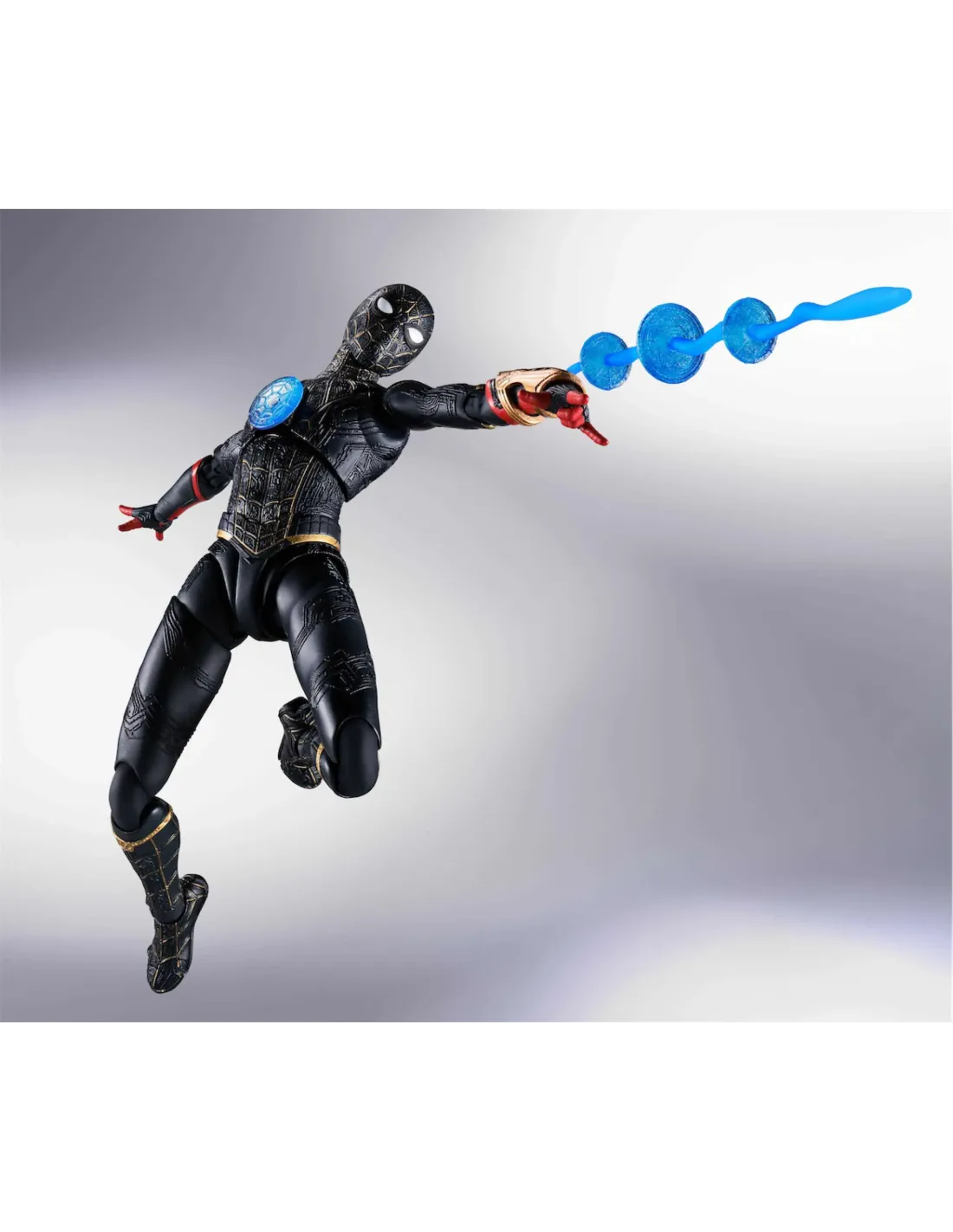 Tamashii Nations presenta para la línea S.H. Figuarts la figura deSpider-man (Black & Gold Suit) Special Set, basado en la nueva película delpersonaje de Marvel "Spider-Man: No Way home". Se trata de una figuraarticulada hecha en PVC que mide unos 15 cm de alto y que incluye mltiplescomplementos para personalizarlo: Cuerpo, 3x pares de manosintercambiables, parte opcional del cuello, disparador de redes, redmágica, complemento mágico del pecho, opciones de ojos reemplazables.Además completa el set una base soporte personalizada con brazoarticulado.