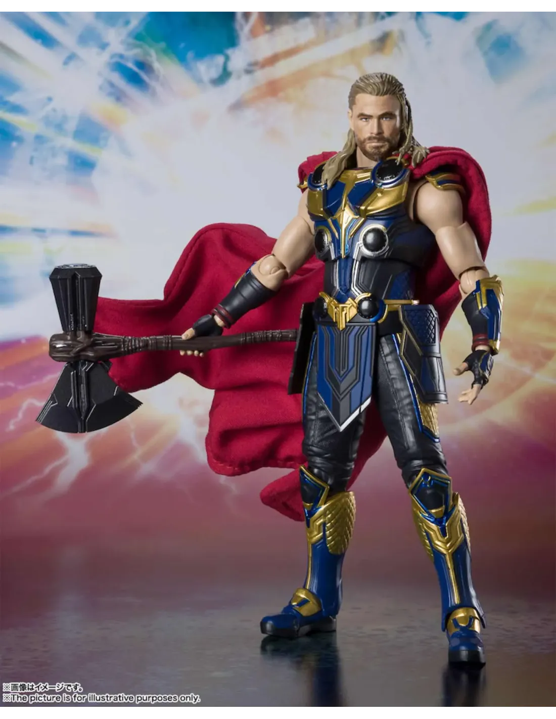 Tamashii Nations presenta para la línea S.H. Figuarts la figura de la nuevaversión de "Mighty Thor" basado en su apariencia en la pelicula Thor: Love& Thunder. La figura mide unos 16,5 cm e incluye una capa con cablesinternos para posabilidad hacen de esta una de las representaciones másdinámicas del héroe que se haya hecho. Se incluye también 1x cabezaopcional, 2x pares de manos opcionales, 1x hacha (Stormbreaker) y 1xparte de efectos.