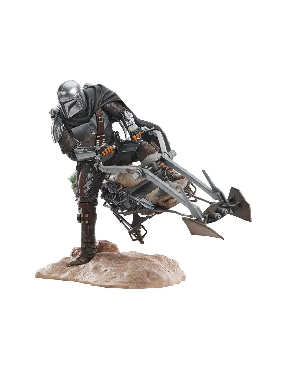 Diamond Select Toys presenta la estatua de Din Djarin dee Star Wars: The Mandalorian. La estatua mide 23 cm a una escala de 1/7. Din se muestra subido a una moto speeder con Grogu colgando de una bolsa en laparte trasera de la moto y uno de los pies de Din tocando el suelo para pivotar su ataque. Contiene un certificado de autenticidad numerado.