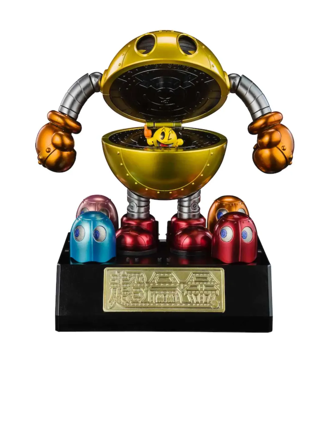 Tamashii Nations presenta esta figura Chogokin del personaje del juegoclásico Pac-Man, diseñado como un robot gigante con golpes voladores,una función de transformación, ¡incluso una cabina en funcionamiento!. Los4 fantasmas incluidos se pueden colocar en las manos y la minifigura dePac-Man dentro de la cabina de unos 2.2 cm. La figura mide 10.5 cm, estáhecha de PVC e incluye una base soporte.