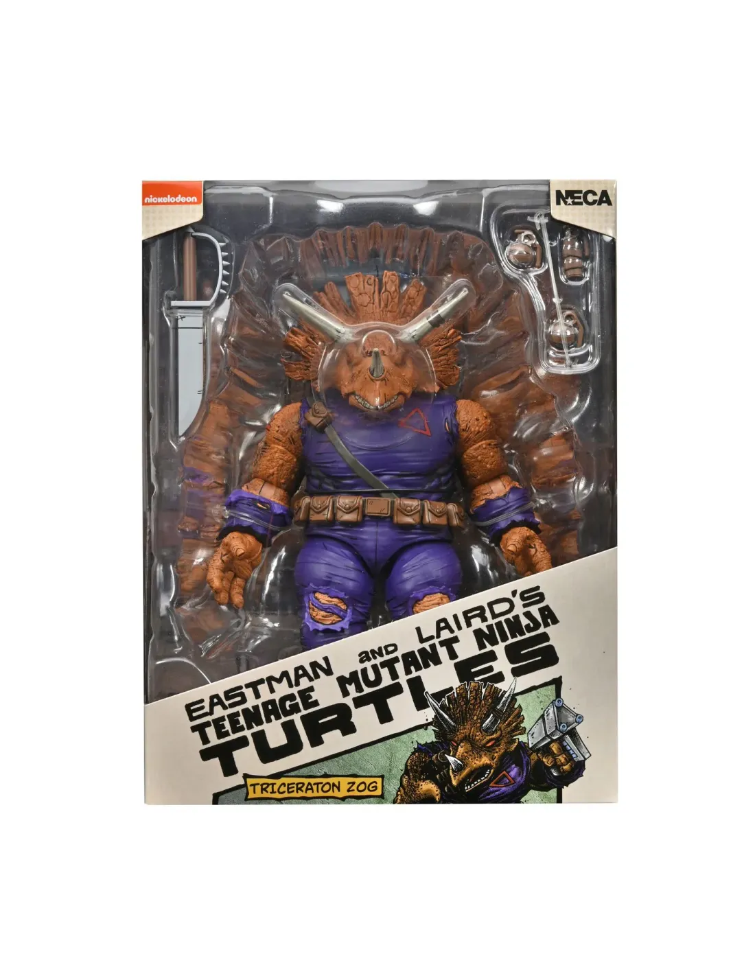NECA anuncia la figura de Zog, el soldado Triceraton que huy a los tºneles despues de escapar del edificio de investigacin. Basado en su aparicin en los comics de Mirage Studios. La figura de lujo mide casi 20 cm e incluye manos adicionales, blaster, granadas y machete. Viene en un nuevo envoltorio especial con ventana y tem¡tica de cmic ilustrado por Kevin Eastman.