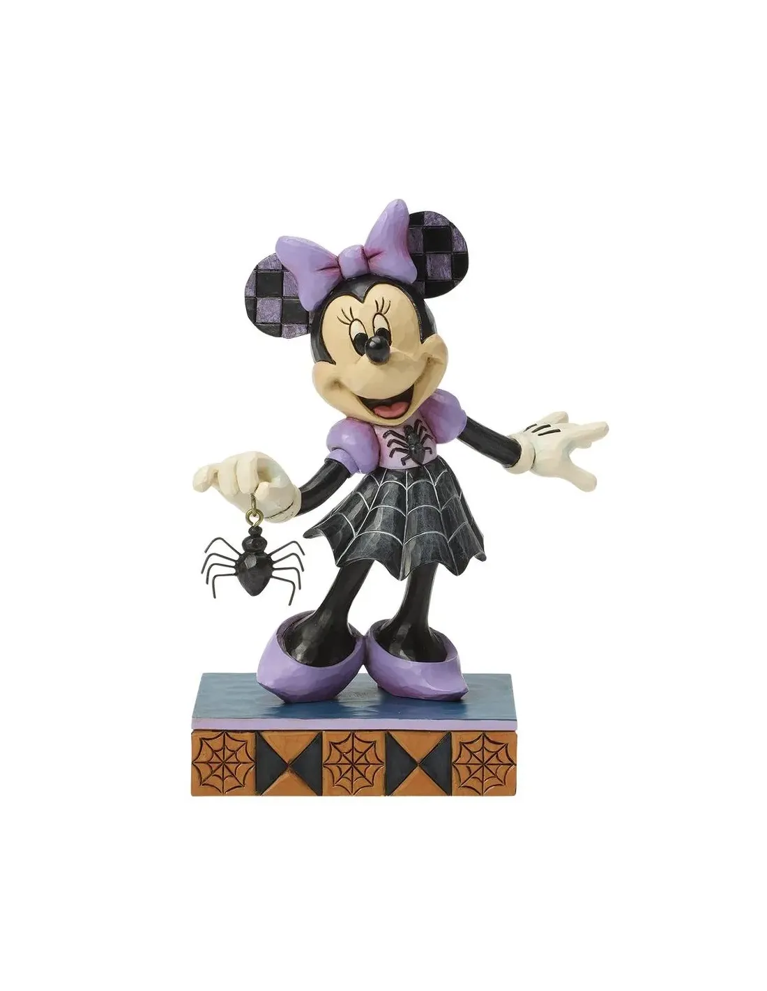 Características de la Minnie in Spider Dress Figurine by Disney Traditions (6017939)La figura Minnie in Spider Dress de Disney Traditions es una pieza decorativa ideal para coleccionistas y amantes del universo Disney. Diseñada por Jim Shore, combina el encanto clásico del personaje con una temática de Halloween, ofreciendo un diseño único que destaca por sus detalles artesanales y estilo inconfundible.Diseño temático de Halloween con estilo DisneyEsta figura presenta a Minnie con un original vestido en tonos morado y negro con motivos de telaraña, aportando un toque festivo y elegante. El detalle de la araña colgante en su mano refuerza su carácter temático, creando una pieza decorativa perfecta para la temporada.Vestido con diseño de telaraña en tonos morado y negroFigura inspirada en HalloweenDetalle de araña colgante en la manoAcabados artesanales y diseño Jim ShoreComo parte de la colección Disney Traditions, esta figura destaca por sus acabados detallados y patrones tallados a mano, característicos del estilo de Jim Shore. La base decorada y los acabados texturizados aportan profundidad y personalidad a la pieza.Diseño exclusivo de Jim ShoreDetalles tallados con patrones decorativosBase decorada con motivos geométricos y de telarañaFigura decorativa para coleccionistasIdeal para fans de Disney o coleccionistas de figuras temáticas, esta pieza combina originalidad, diseño y valor decorativo. Perfecta para decorar estanterías, escritorios o espacios temáticos durante Halloween o todo el año.Referencia del producto: 6017939Colección: Disney TraditionsUso: decoración y coleccionismo