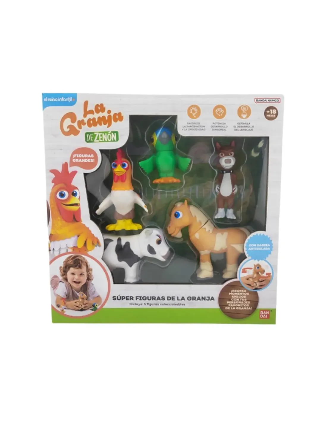 Características del Pack 5 Super Figuras La Granja de ZenónEl Pack 5 Super Figuras La Granja de Zenón es el set ideal para que los más pequeños disfruten recreando las aventuras de sus personajes favoritos. Diseñado para niños a partir de 18 meses, este pack fomenta el juego simbólico, la imaginación y el desarrollo creativo a través de figuras reconocibles y adaptadas a sus manos.Tus personajes favoritos en un solo packEste completo set incluye a los protagonistas más populares de La Granja de Zenón, permitiendo a los niños recrear escenas de la serie o inventar sus propias historias. Una opción perfecta para regalar y ampliar su colección.Lorito PepeGallo BartolitoCaballo PercherónVaca LolaLobo BetoDiseñado para los más pequeñosPensado para niños a partir de +18 meses, este pack ofrece una experiencia de juego sencilla y segura. No requiere pilas, por lo que el entretenimiento es inmediato y sin complicaciones.Edad recomendada: +18 mesesNo necesita pilasModelo: AR85500Dimensiones y presentaciónEl pack se presenta en un formato compacto y fácil de almacenar, ideal tanto para jugar en casa como para transportar.Dimensiones del producto: 13 x 47 x 10 cm