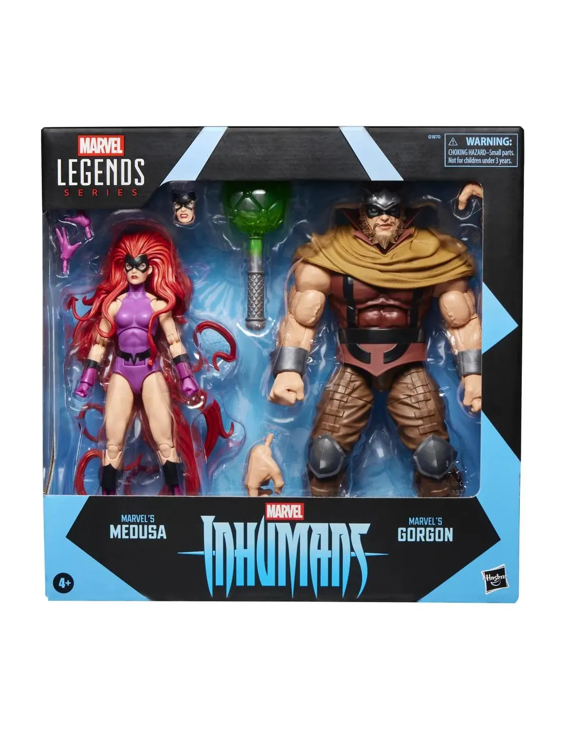 Características del Pack 2 Figuras Hasbro Marvel Legends Series Inhumans: Marvel's Medusa & Marvel's GorgonEste exclusivo pack de la línea **Marvel Legends de Hasbro** incluye a dos personajes icónicos del universo Inhumans: **Marvel's Medusa y Marvel's Gorgon**. Diseñadas para reproducir con fidelidad su aparición en los cómics clásicos de Marvel, estas figuras articuladas son ideales tanto para **coleccionistas** como para **aficionados al universo Marvel** que desean ampliar su colección con piezas detalladas y posables.Diseño cómic y articulaciones premiumAmbas figuras están esculpidas con un alto nivel de detalle para reflejar sus características originales de los cómics de los Inhumanos y Los Cuatro Fantásticos. Gracias a su escala de 15 cm y a su diseño articulado, puedes **recrear escenas dinámicas** o exhibirlas con poses icónicas.Escala de 15 cm (6 pulgadas)Cabezas, brazos y piernas articulablesDiseño inspirado en los cómics de MarvelAccesorios intercambiables para una experiencia completaEl set incluye un total de **6 accesorios** que permiten personalizar y enriquecer las figuras: manos alternativas, una maza y una placa facial adicional. Esta variedad de piezas ofrece **más posibilidades de exposición** y juego.2 manos alternativas y placa facial para Medusa2 manos alternativas y maza para GorgonIncluye 2 figuras + 6 accesorios totalesProducto oficial Marvel LegendsEste pack está pensado para **coleccionistas mayores de 4 años** y cumple con los estándares de calidad de Hasbro. Ideal para estanterías de exhibición o para recrear batallas clásicas del universo Marvel.Fabricado por Hasbro, licencia oficial MarvelEdad recomendada: a partir de 4 añosAdvertencia: contiene piezas pequeñas. No apto para menores de 3 añosOtras especificacionesLínea: Marvel Legends SeriesIncluye: 2 figuras (Medusa y Gorgon) + 6 accesorios