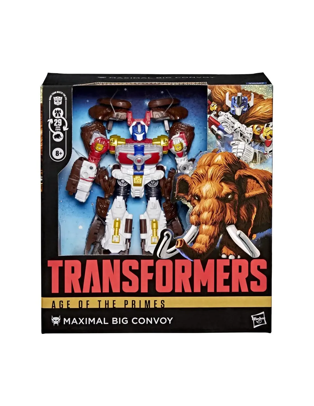 Características de la Figura Hasbro Transformers Age of the Primes Maximal Big ConvoyLa figura **Maximal Big Convoy** de la línea **Transformers: Age of the Primes** está diseñada para los fans de los robots transformables más legendarios. Esta edición **Leader Class**, con un diseño detallado y articulaciones avanzadas, es ideal tanto para el juego como para la exposición en colecciones. Su transformación en mamut y sus accesorios icónicos la convierten en una pieza imprescindible para seguidores del universo Transformers.Diseño articulado y transformación en 29 pasosEsta figura de 16,5 cm ofrece una experiencia de transformación desafiante y entretenida. El proceso se realiza en **29 pasos**, permitiendo cambiarla de modo robot a mamut con gran fidelidad al personaje original.Altura: 16,5 cm (Leader Class)Transformación detallada: de robot a mamutDiseño robusto y fiel a la serieAccesorios icónicos y detalles removiblesMaximal Big Convoy incluye su clásico **gran cañón**, además de otros accesorios que enriquecen el juego y permiten diversas configuraciones. Los colmillos y misiles también son removibles, aportando mayor dinamismo a la figura.Incluye 7 accesorios: cañón, arma, misiles, colmillos y másElementos extraíbles para variar el estiloIdeal para coleccionistas y fans de la franquiciaProducto oficial para coleccionistasForma parte de la serie **Transformers: Age of the Primes**, donde también podrás encontrar otras figuras como **Razorclaw, Alpha Trion o Junkion Jalopy** (se venden por separado). Es una línea que rinde homenaje a personajes clave del universo Transformers.Para mayores de 8 añosIncluye instrucciones ilustradasAdvertencia: contiene piezas pequeñas. No apto para menores de 3 añosOtras especificacionesFabricante: HasbroLínea: Transformers ? Age of the PrimesModo alterno: MamutMaterial principal: Plástico