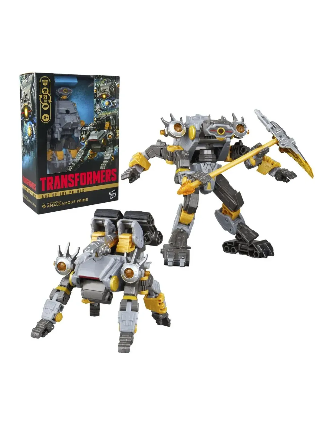 Características de la Figura Hasbro Transformers Age of the Primes The Thirteen Amalgamous PrimeSumérgete en el universo de Transformers con esta figura de colección inspirada en uno de los legendarios Prime originales. La **figura Amalgamous Prime**, parte de la línea **Age of the Primes**, está diseñada para fans y coleccionistas que buscan **detalles fieles, transformaciones complejas y gran versatilidad de exhibición**. Ideal para niños a partir de 8 años y también para adultos coleccionistas.Transformación versátil y diseño articuladoEsta figura **Voyager Class** cuenta con una estructura altamente articulada que permite adoptar diversas poses. Su mecanismo de transformación **con 21 pasos** convierte el robot en un **tanque araña**, añadiendo un nivel extra de originalidad al diseño.Altura aproximada: 14 cmTransformación en 21 pasosModo alterno: tanque arañaAccesorios intercambiables y componentes múltiplesLa figura puede dividirse en **vehículos más pequeños y armas desmontables**, lo que amplía las posibilidades de juego y exposición. Incluye accesorios temáticos como un orbe y una guadaña, que refuerzan la estética única del personaje.Accesorios incluidos: orbe y guadañaIncluye 5 piezas adicionales desmontablesCompatible con otras figuras de la línea Age of the PrimesIdeal para coleccionistas de TransformersAmalgamous Prime forma parte del lore clásico de los Transformers, siendo uno de los Trece Primes originales. Combínala con otras figuras de la serie como **Big Convoy**, **Brawl** o **Wreck-Gar** (se venden por separado) para completar tu colección.Diseño inspirado en los personajes clásicos de TransformersPerfecta para coleccionistas y fans de la franquiciaA partir de 8 añosOtras especificacionesContenido del paquete: figura, 5 piezas y manual de instruccionesAdvertencia: peligro de asfixia por piezas pequeñasNo apto para niños menores de 3 años