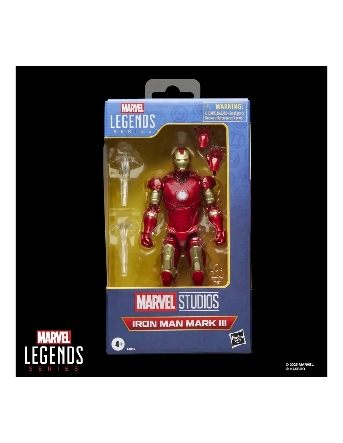 Características de Iron Man Mark III Marvel Legends SeriesLa figura **Iron Man Mark III** de la línea **Marvel Legends Series** está pensada para fans y coleccionistas que buscan **detalle, articulación y fidelidad cinematográfica**. Fabricada por Hasbro bajo licencia oficial de Marvel, esta versión del icónico traje Mark III ofrece una excelente combinación entre diseño realista y posibilidades de posado para exhibición.Diseño premium y alto nivel de detalleEsta figura destaca por su **esculpido preciso y un acabado metálico de alta calidad**, que reproduce fielmente la armadura vista en el Universo Cinematográfico de Marvel. El formato de 15 cm la hace compatible con otras figuras de la misma línea.Altura aproximada: 15 cmMaterial: PVC con detalles pintadosLicencia oficial MarvelArticulaciones y accesorios para posados dinámicosCon **más de 20 puntos de articulación**, la figura permite recrear una amplia variedad de poses de acción. Además, incluye accesorios intercambiables para potenciar su versatilidad y realismo.Incluye 2 manos alternativas2 efectos de propulsión translúcidosDiseñada para posados y colecciónPresentación ideal para coleccionistasLa figura viene en un **empaque tipo ventana**, perfecto para quienes desean exhibirla sin sacarla de la caja. Su presentación cuidada y el acabado visual la convierten en una excelente opción para coleccionistas de Marvel.Packaging con ventana frontalFabricante: HasbroEdición limitadaOtras especificacionesPeso: 190 g