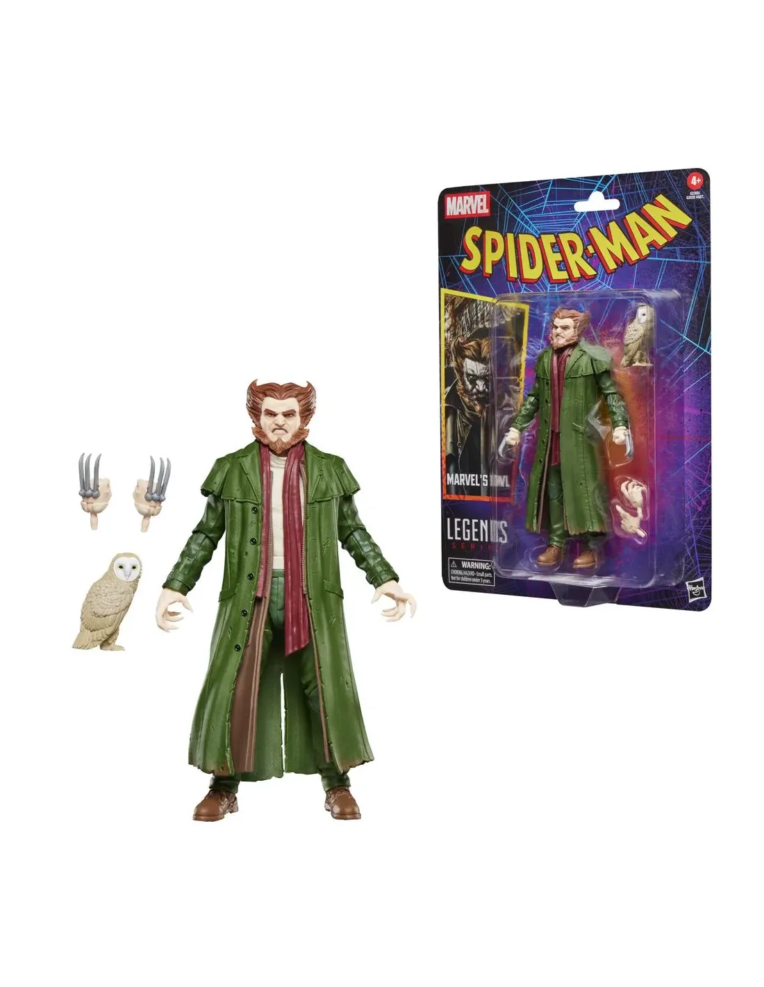 Características de la Figura Hasbro Marvel Legends Series Spider-Man Marvel's OwlLa figura de acción **Marvel's Owl** de la línea **Marvel Legends Series de Hasbro** trae a tu colección todo el carisma y amenaza de este villano clásico del universo de Spider-Man y Daredevil. Diseñada para coleccionistas y fans del universo Marvel, esta figura reproduce con gran fidelidad el estilo de los cómics clásicos, con acabados premium y accesorios exclusivos. Ideal tanto para exhibición como para recrear escenas emblemáticas.Diseño inspirado en los cómics de MarvelEsta figura representa al temido **Marvel's Owl**, con detalles visuales que rinden homenaje a su aparición en los cómics. Su vestimenta, expresión facial y accesorios están cuidados al máximo detalle, ofreciendo una pieza visualmente impactante y reconocible.Diseño clásico basado en los cómics de Spider-Man y DaredevilIncluye bufanda removible para personalizar su aparienciaAcabados de calidad y detalles fieles al personajeArticulaciones y accesorios para mayor versatilidadPensada tanto para posado como para exhibición, esta figura cuenta con **cabeza, brazos y piernas articulables**, permitiendo una amplia variedad de posiciones. Además, incluye accesorios intercambiables que añaden realismo y opciones de juego o montaje.Altura aproximada: 15 cm3 accesorios: 2 manos alternativas y un búho mascotaCompatible con otras figuras Marvel Legends de 15 cmIdeal para coleccionistas MarvelYa sea para ampliar tu colección o como pieza destacada, **Marvel's Owl** se integra perfectamente en cualquier estantería Marvel Legends. Su escala y nivel de detalle la convierten en una figura imprescindible para los fans de Spider-Man y el universo urbano de Marvel.Figura articulada con alto nivel de detallePerfecta para recrear escenas de los cómicsIncluye figura y 3 piezas adicionalesAdvertencias de seguridadProducto no apto para niños menores de 3 añosContiene piezas pequeñas que pueden provocar asfixia