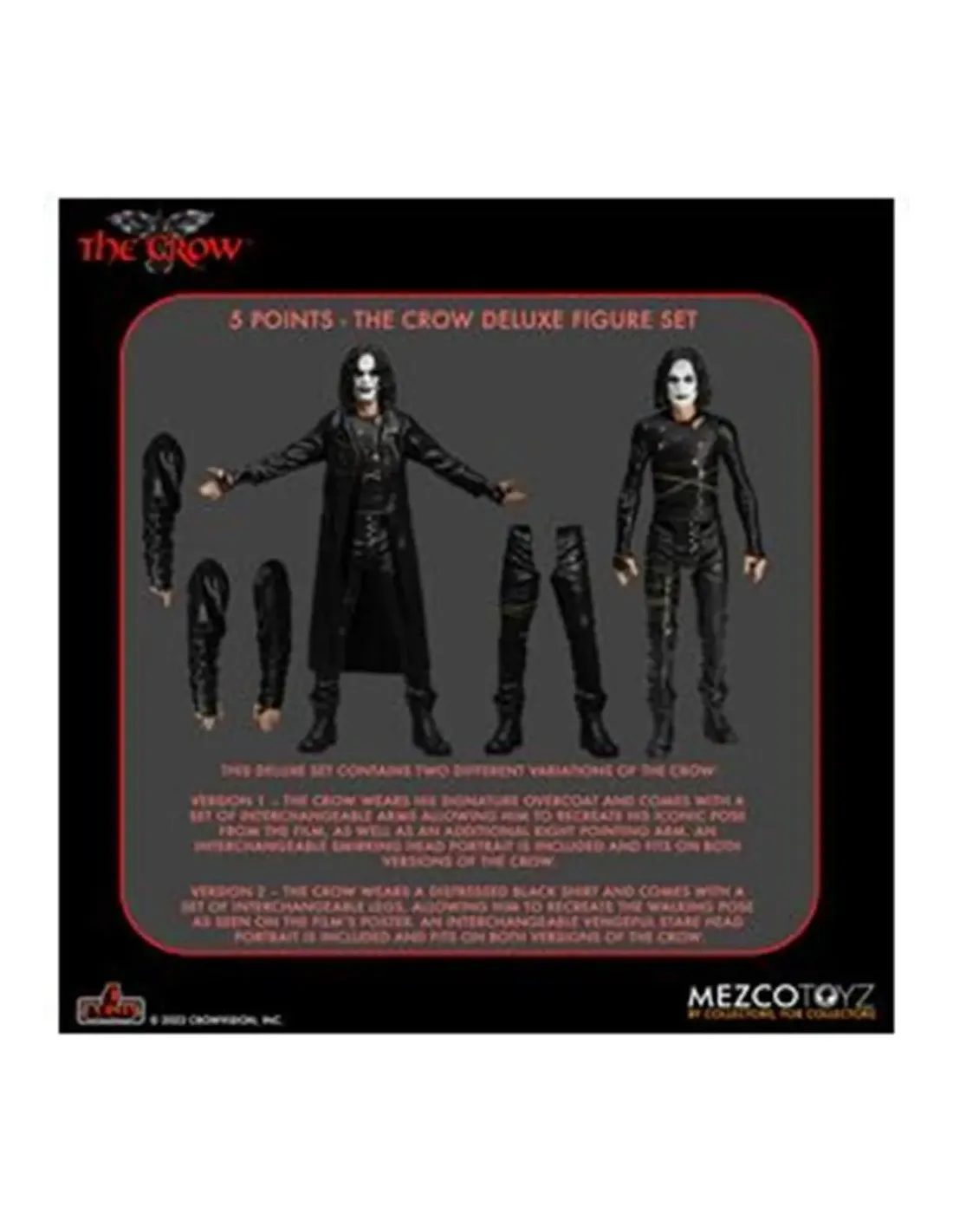 Características de la THE CROW DELUXE SET 2 FIGURAS 10 CM THE CROW 5 POINTSEl set The Crow Deluxe Set 5 Points XL de Mezco Toyz es una opción imprescindible para coleccionistas y fans de la icónica película "El Cuervo". Este pack incluye dos figuras detalladas del protagonista, representadas en diferentes versiones, ideales para exposición o para ampliar cualquier colección. Con un diseño fiel al personaje y accesorios intercambiables, ofrece versatilidad y valor en un formato compacto.Doble figura para una exposición más completaEste set incluye dos versiones del protagonista, permitiendo recrear distintas escenas o estilos del personaje. Las figuras mantienen una estética cuidada y coherente con la película, lo que las convierte en una pieza atractiva para cualquier fan.2 figuras del protagonistaAltura aproximada: 9-10 cmVersiones con gabardina y sin gabardinaAccesorios intercambiables para mayor personalizaciónEl set incorpora extremidades adicionales que permiten modificar la pose de las figuras, aportando dinamismo y opciones de personalización en la exposición.3 brazos intercambiables2 piernas adicionalesFacilidad para cambiar las piezasDiseño coleccionable y presentación cuidadaFormando parte de la línea 5 Points XL de Mezco Toyz, este set destaca por su estilo compacto y detallado. Se presenta en una caja sin ventana, pensada para proteger el contenido y mantener su carácter coleccionable.Colección: 5 Points XLFabricante: Mezco ToyzPresentación en caja cerrada