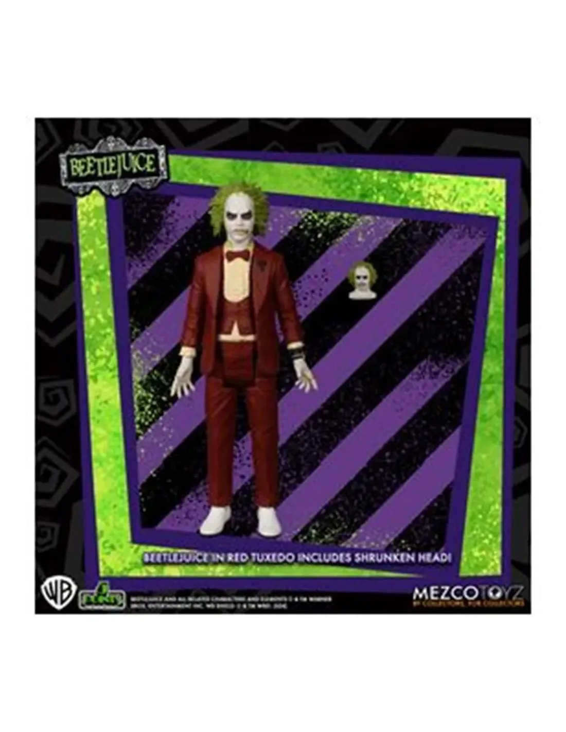 Características de la Figura Beetlejuice Red Tux 9,5 cm 5 Points MezcoLa figura Beetlejuice Red Tux de Mezco es una pieza imprescindible para fans del cine clásico y coleccionistas. Inspirada en la icónica escena de la boda de la película "Beetlejuice" (1988), esta figura destaca por su diseño detallado y estilo retro dentro de la reconocida línea 5 Points. Compacta y fiel al personaje, es ideal tanto para exposición como para ampliar cualquier colección.Diseño inspirado en la escena más icónicaEsta figura representa a Beetlejuice con su llamativo esmoquin rojo, tal y como aparece en la inolvidable secuencia de la boda. Su estética captura la esencia del personaje con un enfoque fiel y reconocible.Basado en la película "Beetlejuice" (1988)Traje rojo característico de la escena de la bodaEstilo visual clásico de la línea 5 PointsFormato compacto con detalles intercambiablesCon un tamaño de 9,5 cm, esta figura ofrece un equilibrio perfecto entre detalle y manejabilidad. Además, incluye un accesorio intercambiable que permite variar su apariencia.Altura aproximada de 9,5 cmCabeza reducida intercambiable (quita y pon)Diseño pensado para coleccionistasPresentación en blíster para colecciónLa figura se presenta en un envase tipo blíster, ideal tanto para su protección como para su exposición sin necesidad de abrirla. Perfecta para quienes valoran el producto en su estado original.Embalaje tipo blísterProtección durante almacenamiento y transporteIdeal para exposición en colección