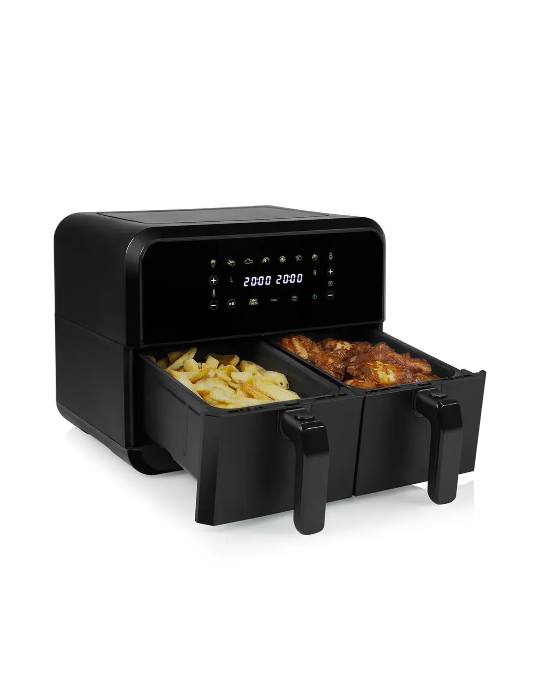 Con esta freidora Aerofryer con doble cesta podrá preparar dos tipos de alimentos al mismo tiempo. Tiene un volumen total de 8 l, 2400 W de potencia y función sync finish. ¡Prepare la cena de una sola vez!
