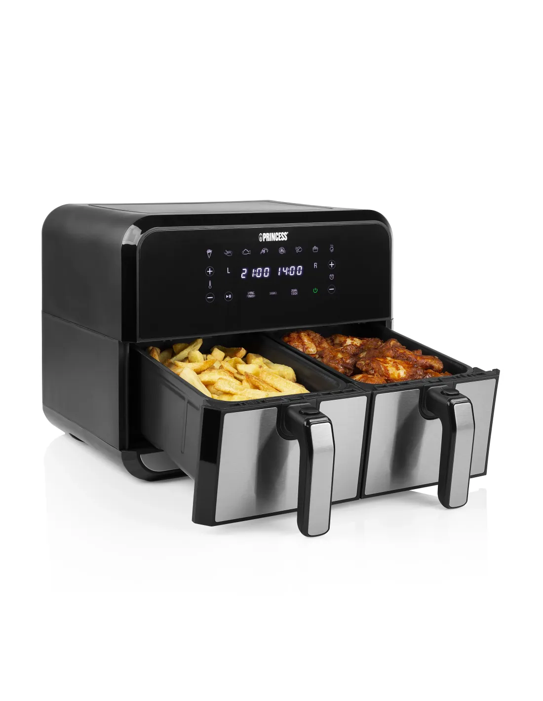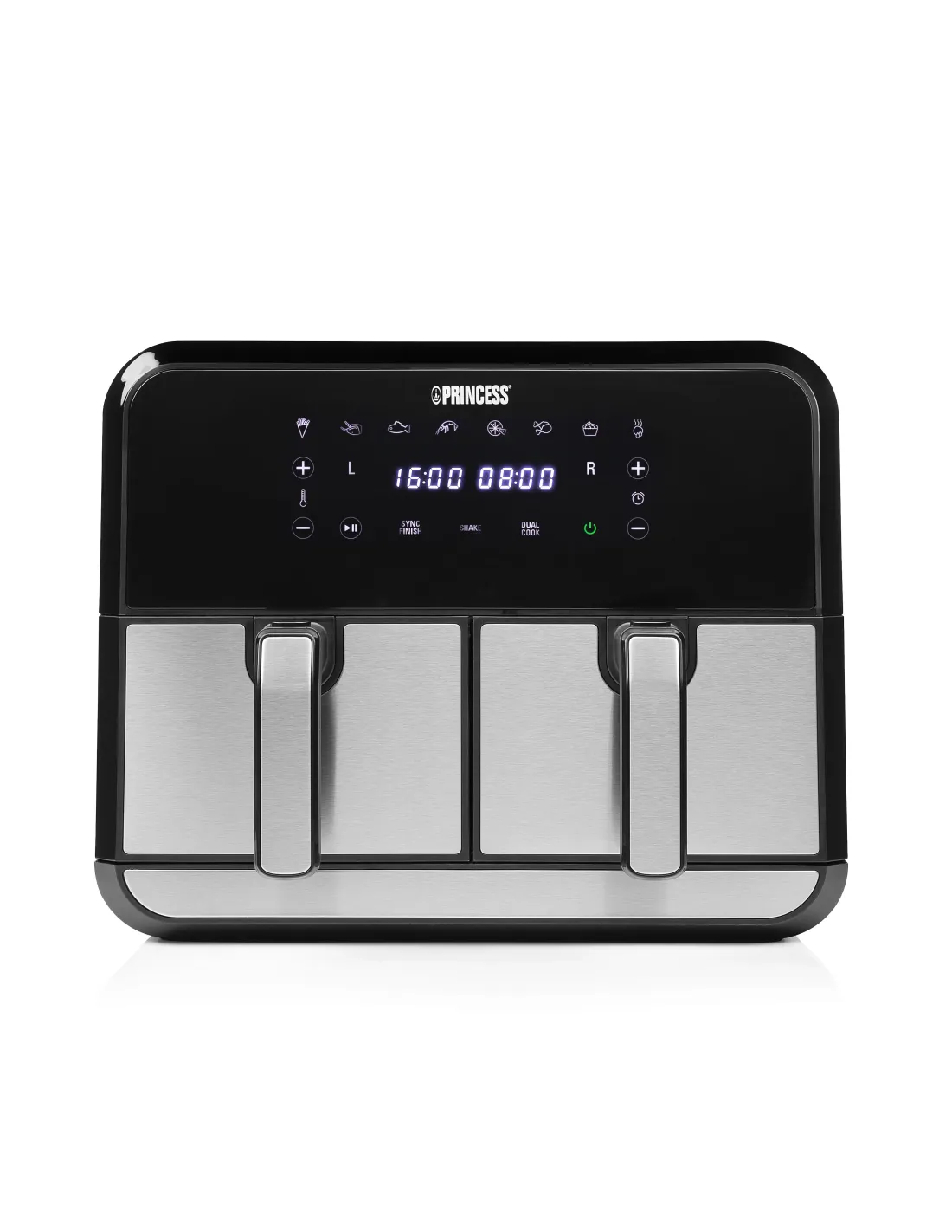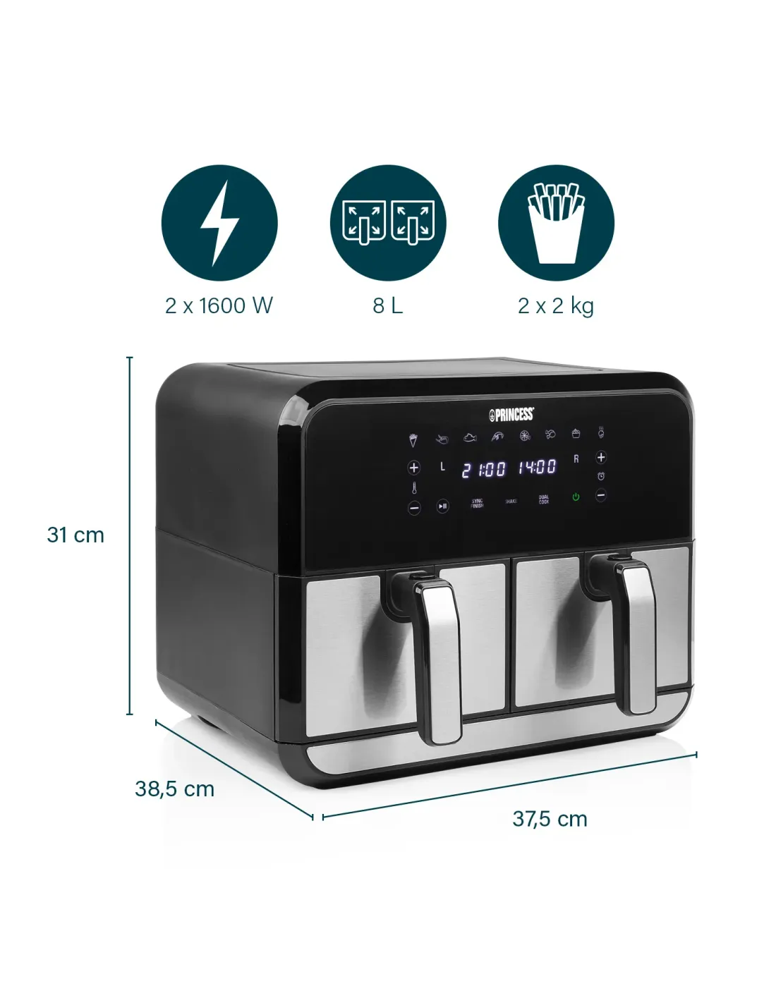 Princess 01.182074.01.001 Double Basket Aerofryer. Tipo de producto: Freidora de aire caliente, Capacidad: 8 L, Capacidad de fritura: 2 kg. Tipo de construcción: Doble, Color del producto: Negro, Acero inoxidable, Tipo de control: Tocar. Potencia: 1700 W, Voltaje de entrada AC: 230 V, Frecuencia de entrada AC: 50 / 60 Hz. Ancho: 375 mm, Profundidad: 385 mm, Altura: 310 mm. No contiene: Bisfenol A (BPA), País de origen: China