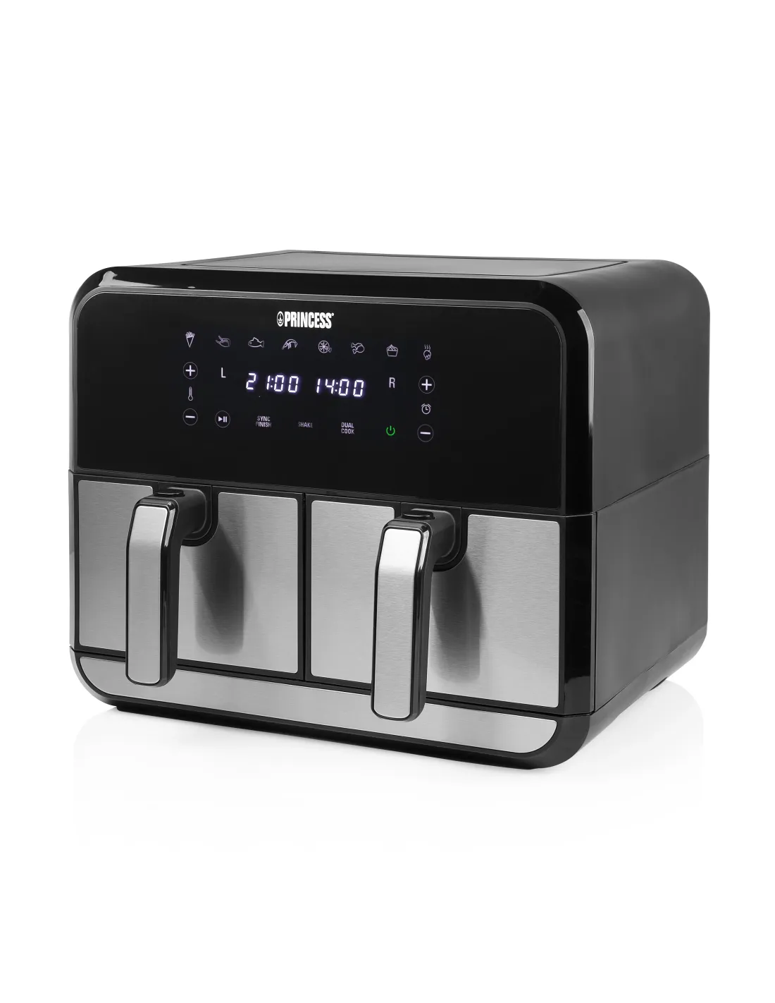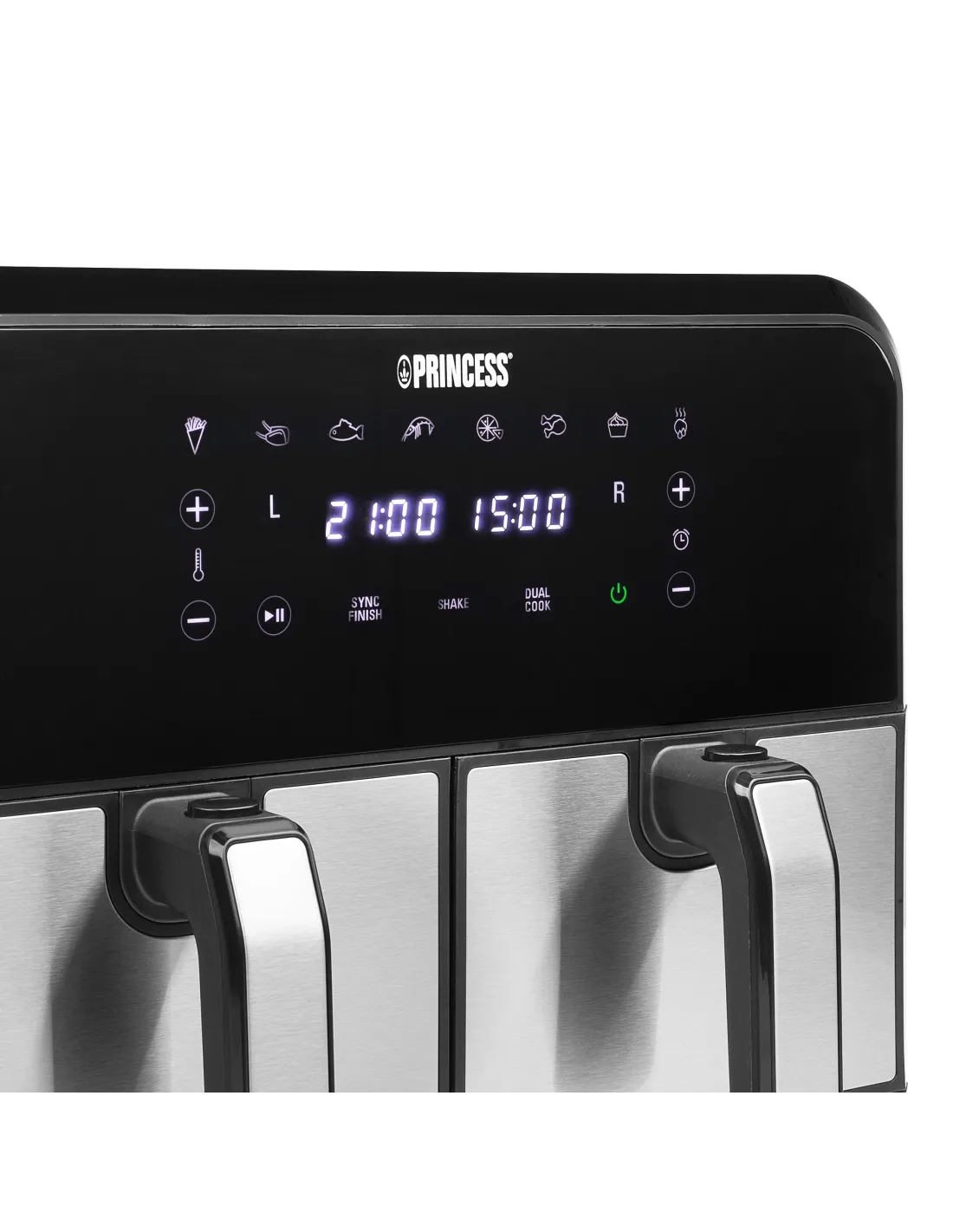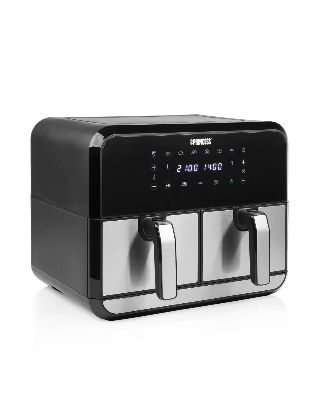 Princess 01.182074.01.001 Double Basket Aerofryer. Tipo de producto: Freidora de aire caliente, Capacidad: 8 L, Capacidad de fritura: 2 kg. Tipo de construcción: Doble, Color del producto: Negro, Acero inoxidable, Tipo de control: Tocar. Potencia: 1700 W, Voltaje de entrada AC: 230 V, Frecuencia de entrada AC: 50 / 60 Hz. Ancho: 375 mm, Profundidad: 385 mm, Altura: 310 mm. No contiene: Bisfenol A (BPA), País de origen: China