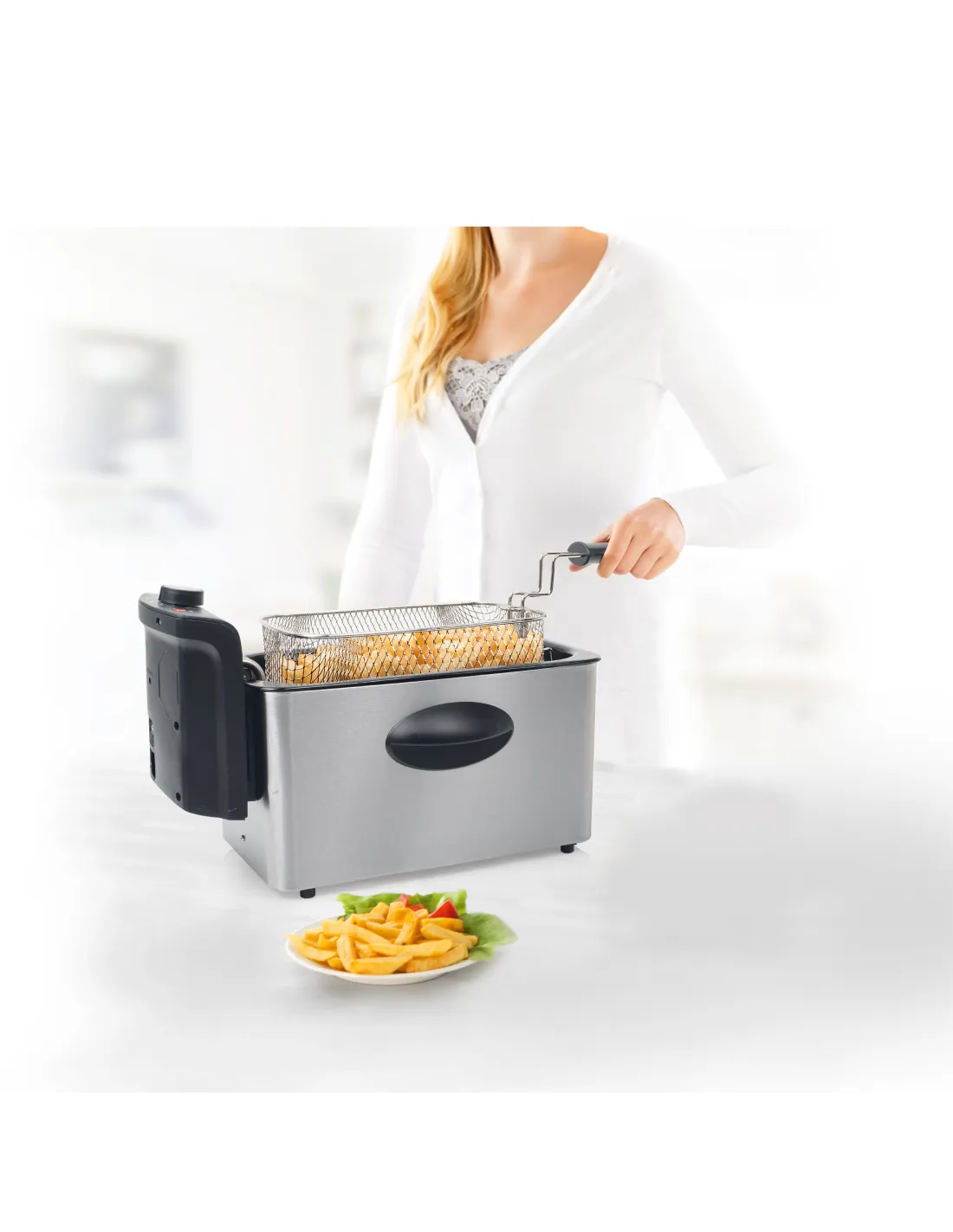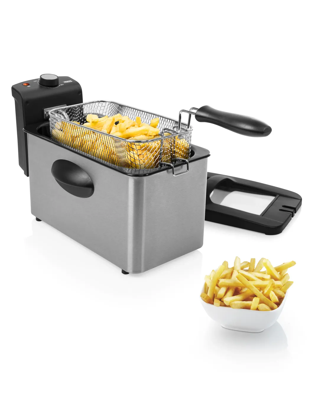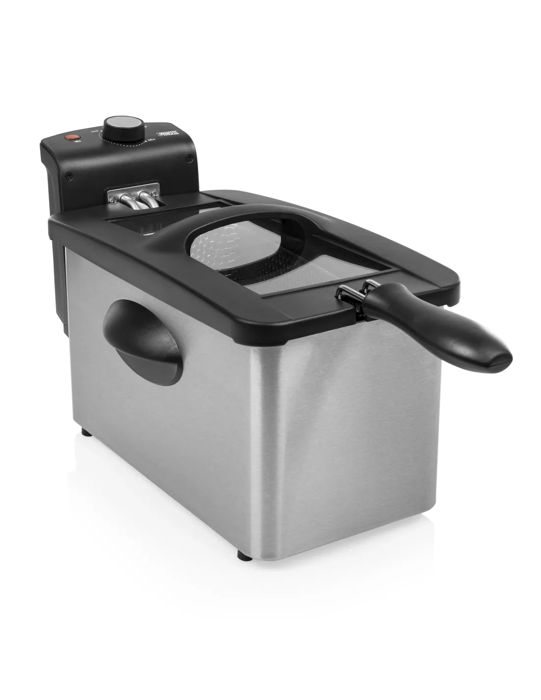 Gran freidora con capacidad de 3 L. Calienta rápidamente gracias a su potencia de 2000 V. Ahora siempre podrá comprobar sus patatas a través del cristal de la tapa.